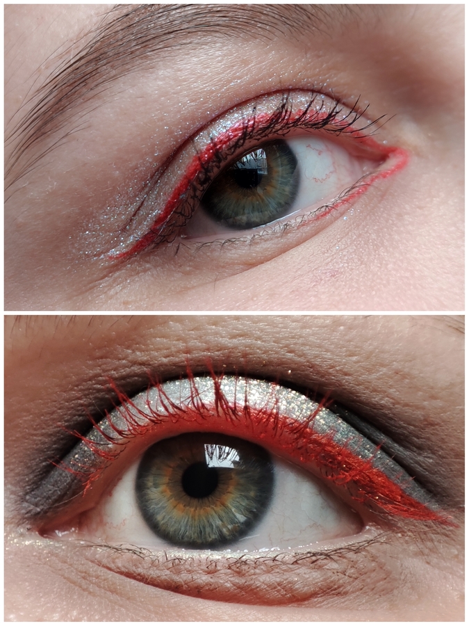 Красная подводка с шиммером. Превзошла мои ожидания. Наконечник — кисть. Довольно стойкая и долгоиграющая. Пользовалась год, сейчас уже не хватает на второй глаз. Поживет еще со мной, пока ищу ей замену, но по сути она уже все. Хорошая была.