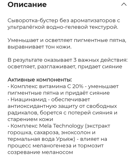 Объем большой, и расход экономный. Сама по себе текстура лёгкая, как водичка, очень быстро распределяется по коже, впитывается за минуту. Липкость минимальная, но я сверху крем всегда наношу. Заметила лёгкое осветление тона кожи, и сами пигментные пятна не так заметны стали.