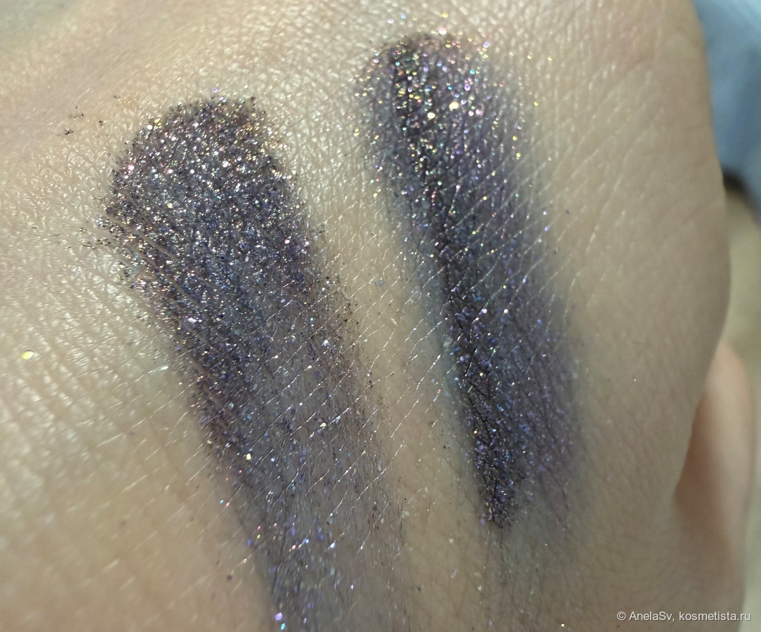 Производитель описывает его как туманный фиолетовый со вкраплениями шиммера, и это так. По мне это темный сине-фиолетовый оттенок со всеми цветами радуги блесток. Есть как крупные, так и мелкие сияшки.