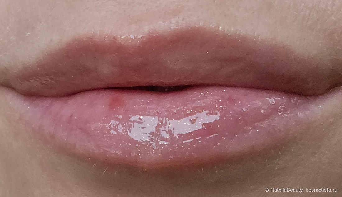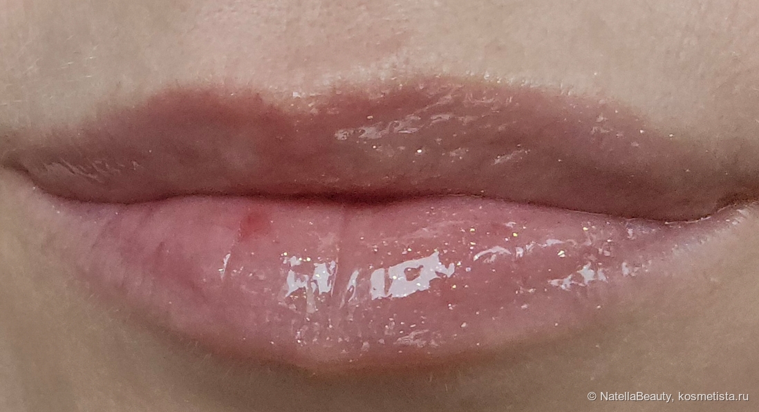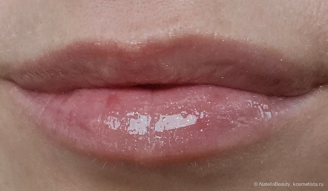 Блеск прекрасно распределяется по губам, симпатично на них смотрится. Не подчеркивает сухость и шелушения, сглаживает их. Но оттенок прозрачный и не перекрывает оттенок губ, делает их просто лучше.