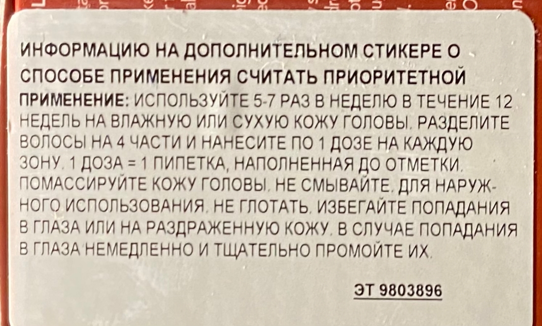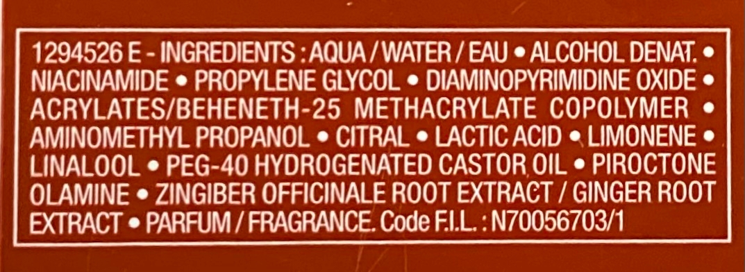 Основной действующий компонент — Аминексил в дозировке 1,5%. Это один из немногих компонентов с доказанной эффективностью против выпадения, уменьшает выпадение и продливает их жизненный цикл. Ещё в составе можно отметить Аргинин — аминокислота, которая улучшает питание волосяных луковиц, Кофеин, стимулирующий микроциркуляцию кожи головы, «будит» фолликулы и может ускорять рост. Ниацинамид (витамин B3), который улучшает состояние кожи головы, снижает раздражение и укрепляет барьер. В целом состав рабочий, без откровенно бесполезных компонентов, в котором всё направлено именно на укрепление и стимуляцию.