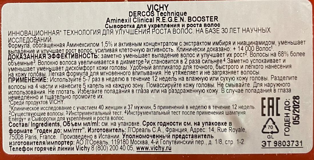 Последний раз именно ради длины я серьёзно подключала такие средства в 2018 или 2019 году после не самого удачного похода в салон, где меня подстригли гораздо короче, чем мы обсуждали с мастером. И вот спустя годы я снова вернулась к этой практике. Опять стрижка, и опять короче, чем надо и чем удобно. Так как нужен был понятный гарантированный результат, мой выбор пал на Сыворотку для укрепления и роста волос Dercos Aminexil Regen Booster Hair Renewing Serum от Vichy.
