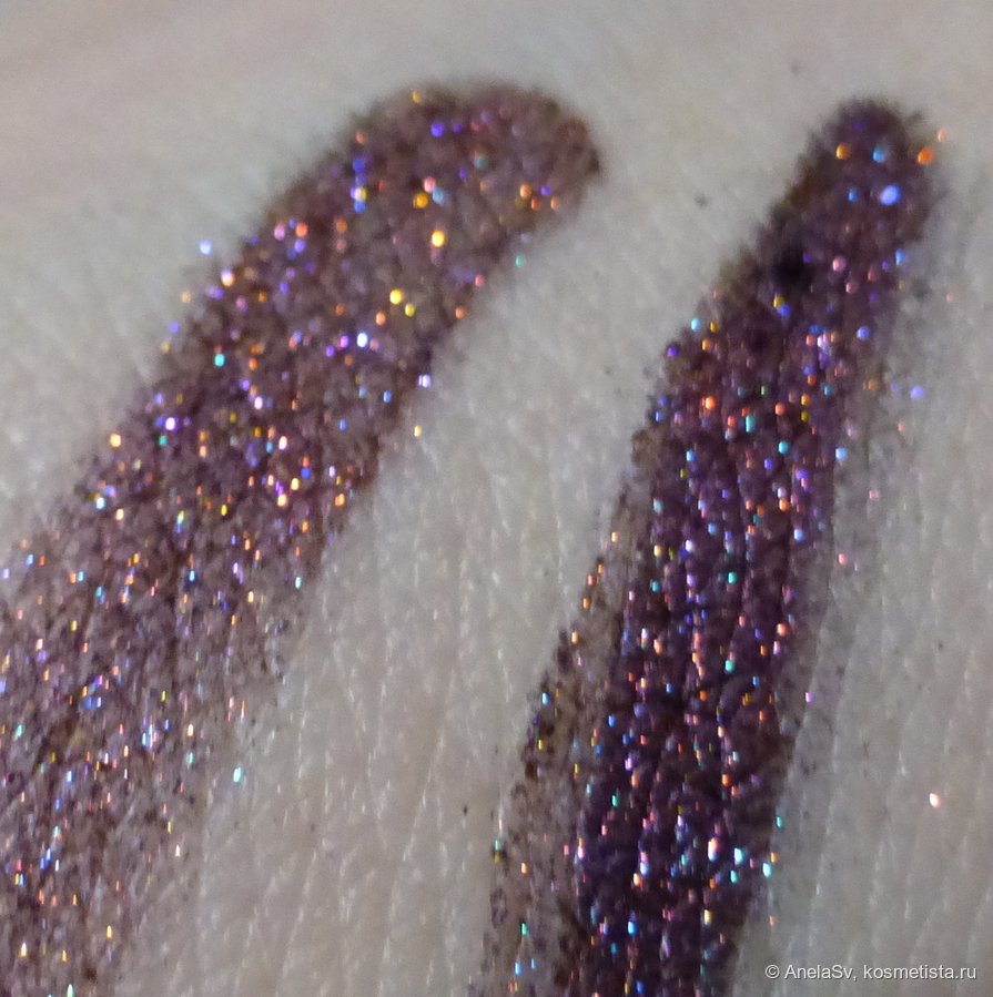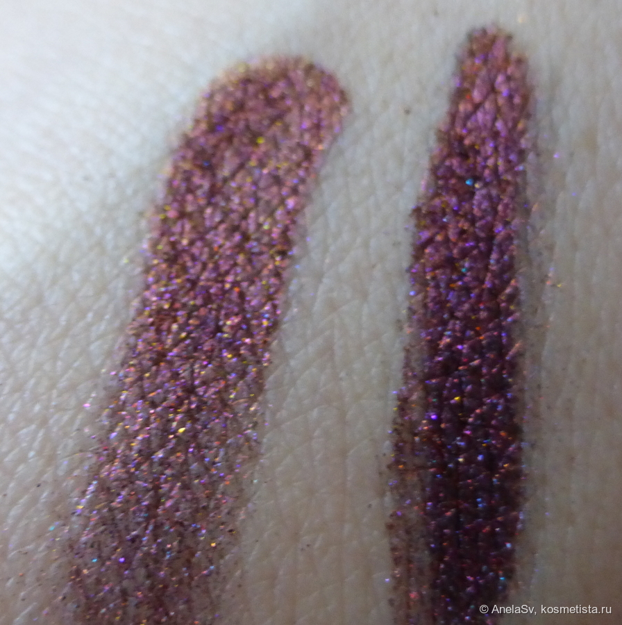 Как я уже сказала, оттенок очень красивый — необычный и многогранный. На солнце и в вечернем освещении искорки играют и переливаются. Но в нанесении пигмент не самый простой — он может осыпаться. Наносится плотно влажным слоем, но больше всего я люблю набивать на черный кайал.