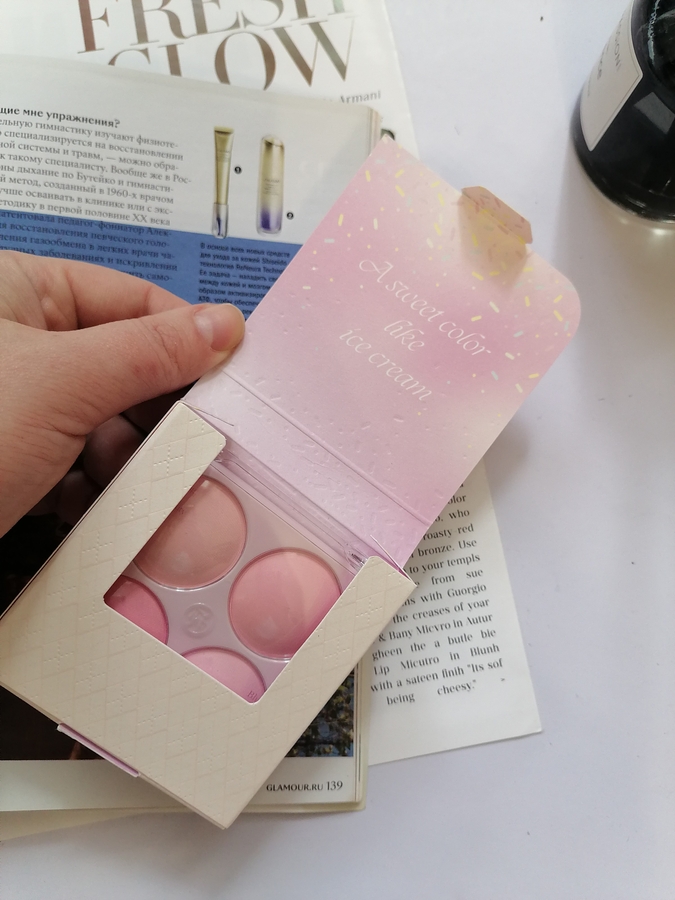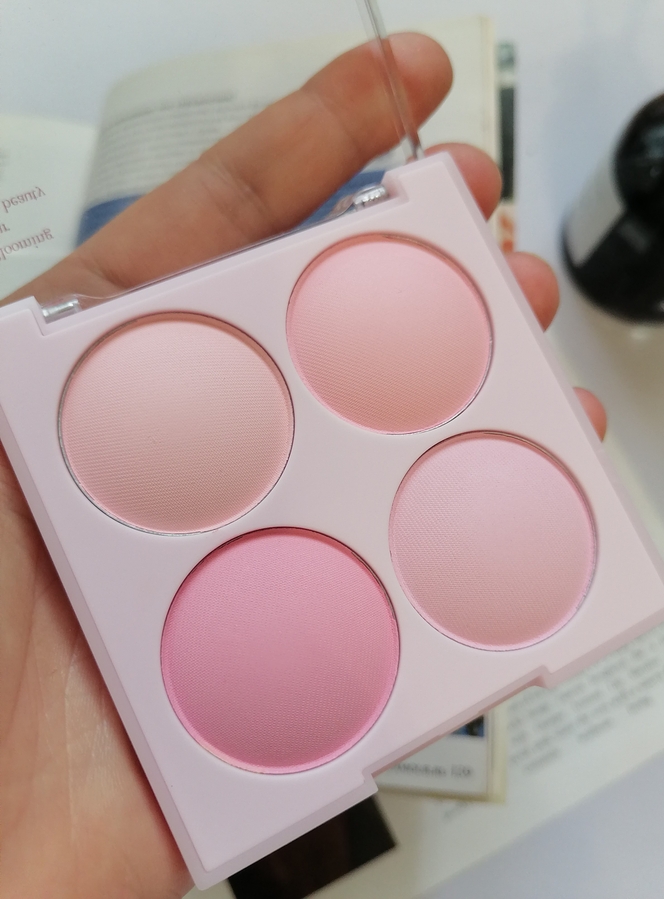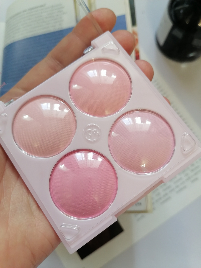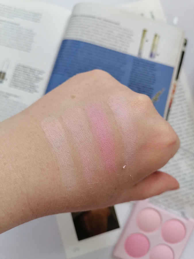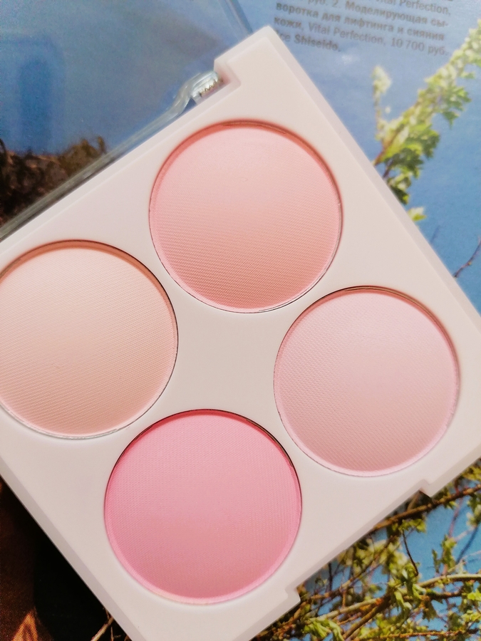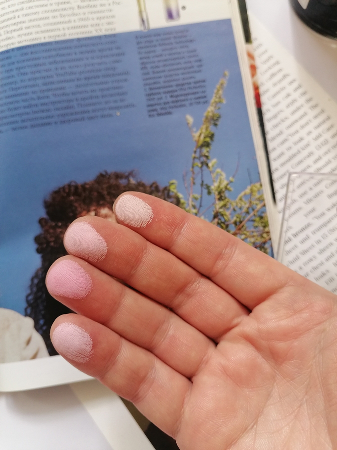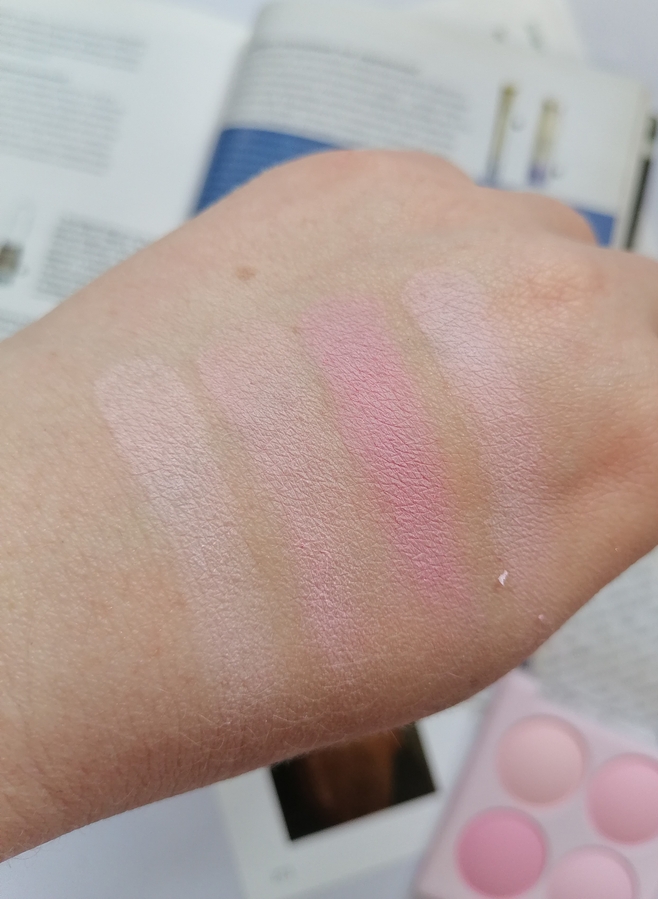 Пигментация — минимальная, это скорее даже больше пудры, чем румяна. Самая большая пигментация у холодного розового, менее насыщенная у розового и персикового, что по краям от розового и у одного персикового оттенка пигментация скорее пудры.