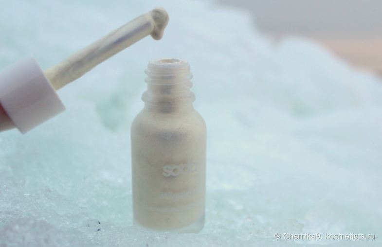 Этот хайлайтер входит в тройку хайлайтеров Soda. Все они представлены в удобных флаконах, похожих на детскую бутылочку, разница только в цвете. У меня оттенок 002, название которого переводится как голос русалки.