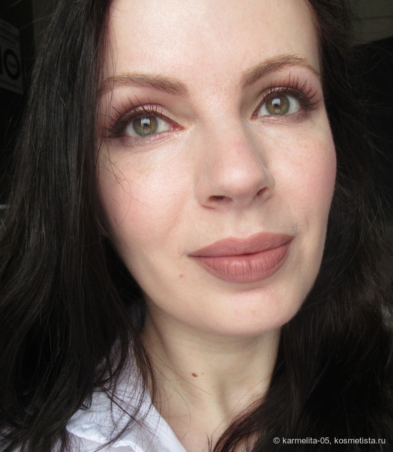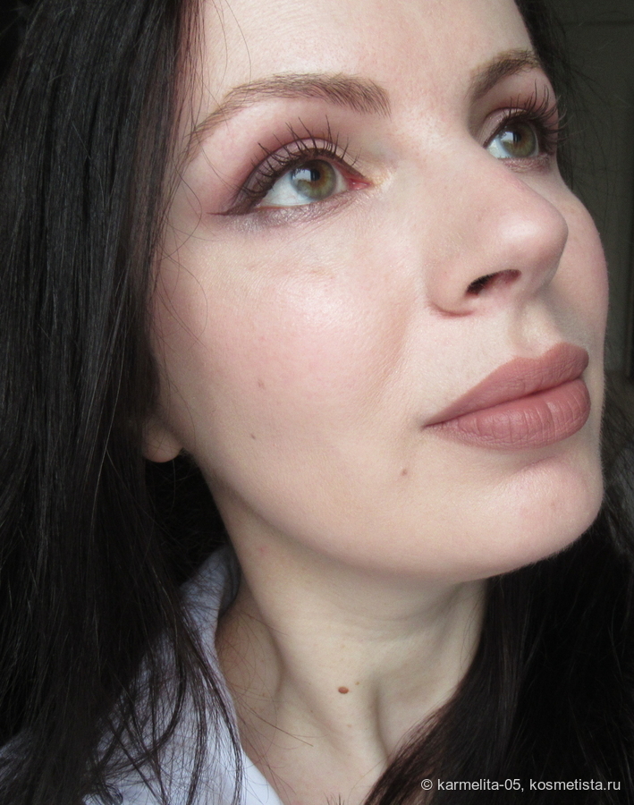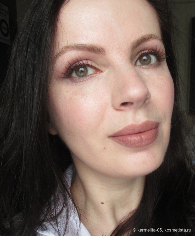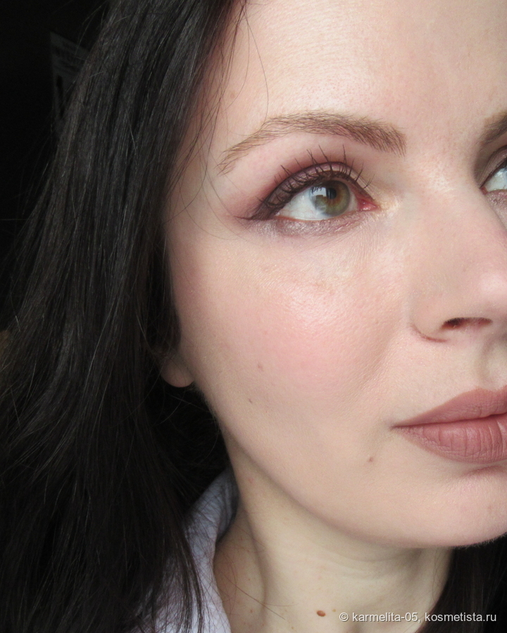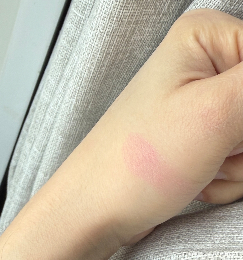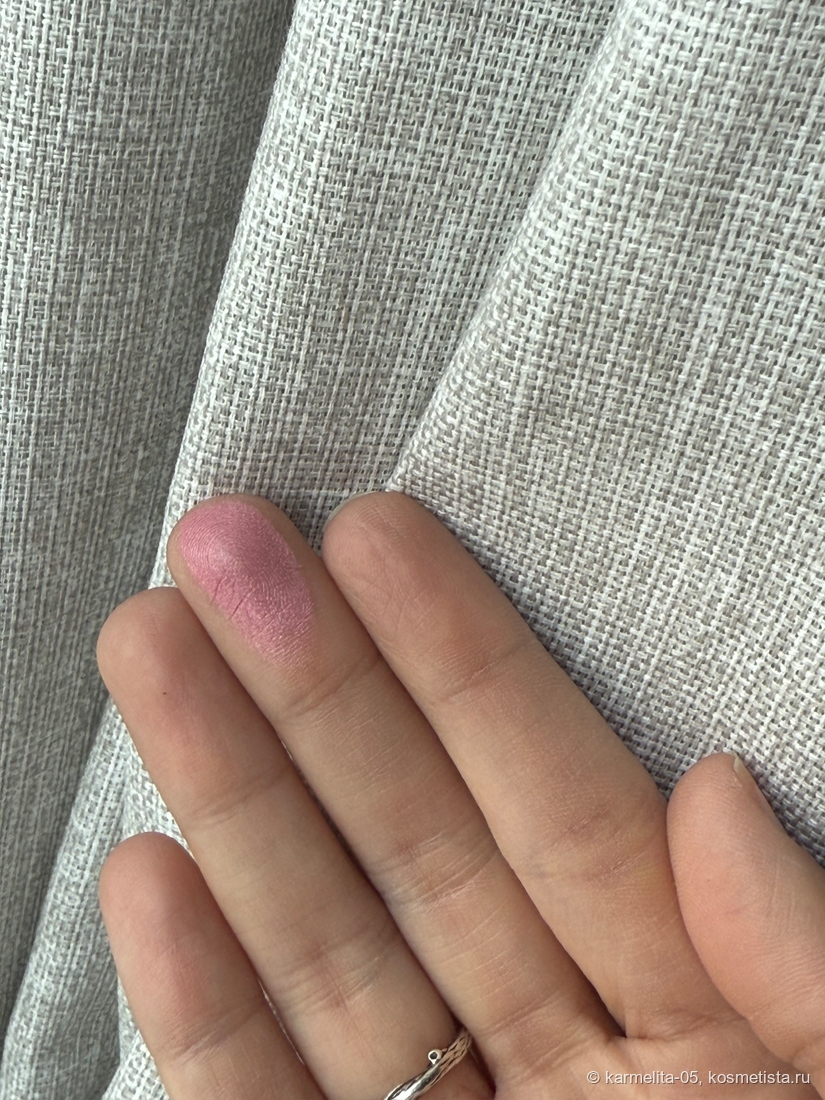 Оттенок самый что ни на есть морозный — абсолютно холодный чистый розовый, с легким блеском. На тоне/пудре лежит до демакияжа, никуда не мигрирует и не стирается.