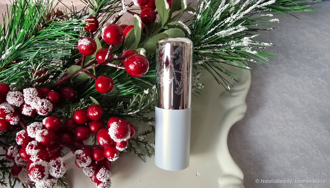 Сама помада находится в пластиковом жемчужном футляре, пластик легкий. Сама крышка металлическая серебристая с изображением узора на замороженном окне. Выглядит очень красиво! Но крышка не магнитная и ее нужно плотно закрывать с легким усилием.