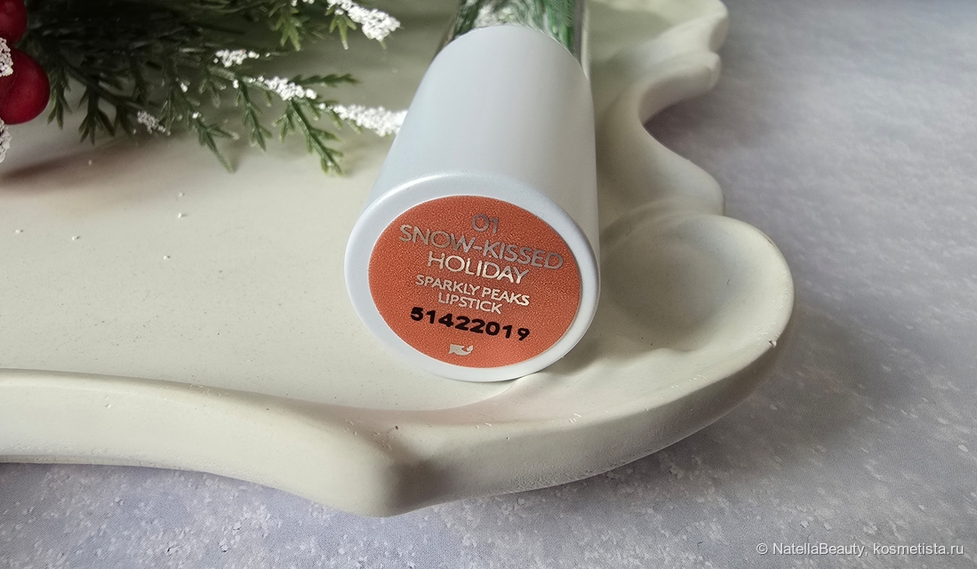 Помада находится в белой картонной коробочке с металлизированными снежинкой и надписью. Снежинка в 3d формате очень красиво выглядит. Само название коллекции сделано в красном цвете как и крышечка коробочки.