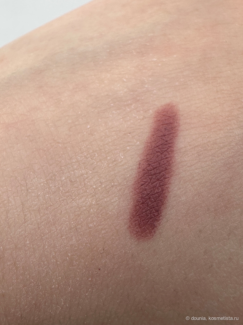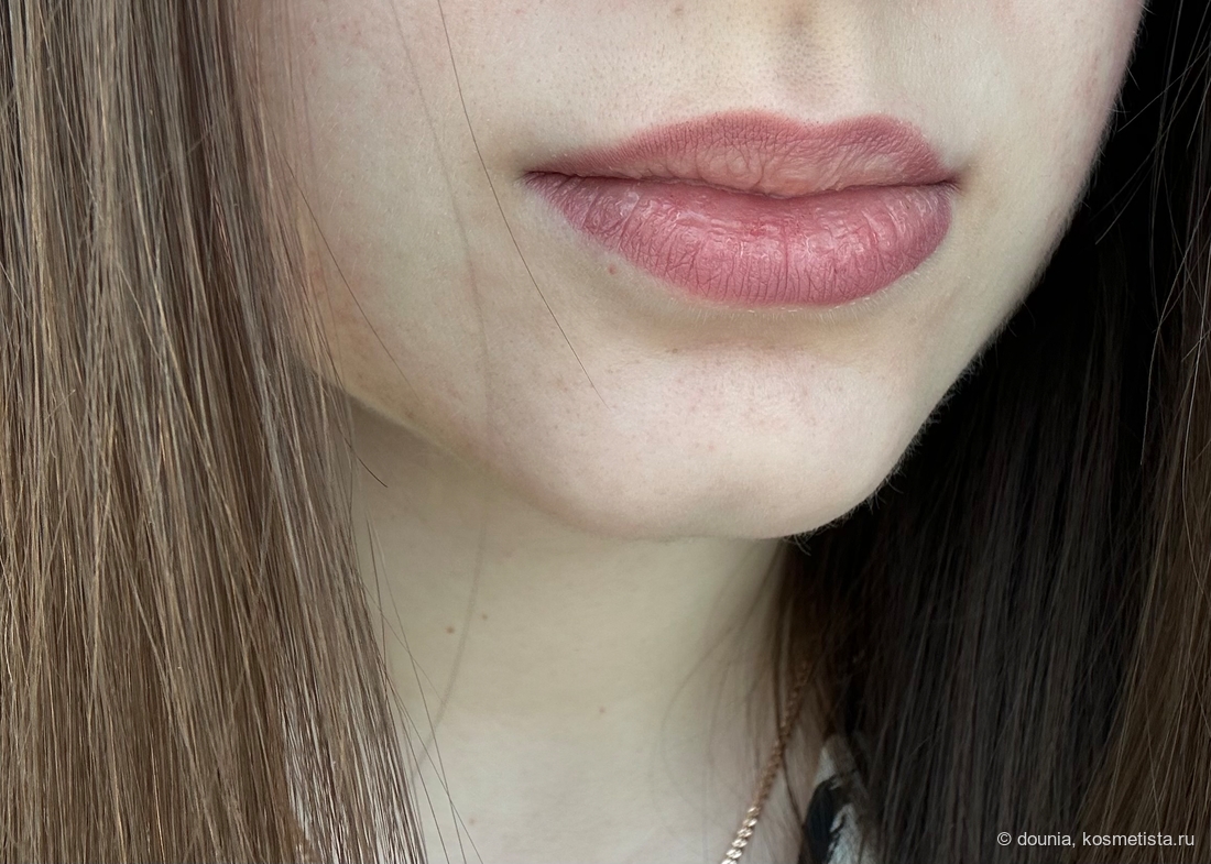 Карандаш в меру мягкий, даже могу назвать его сливочным и легко скользить по коже. Можно использовать как в качестве контура, так и закрасить губы полностью — он не сушит их в носке, но у меня цепляется за шелушения, поэтому предварительная подготовки губ бальзамом просто обязательна.