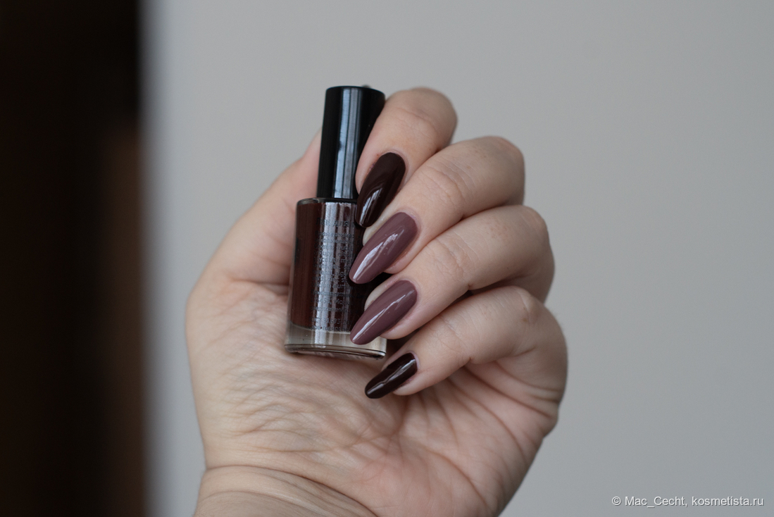 Shock Coffee, по словам марки, «темно-шоколадный с теплым подтоном». И вот тут я снова поспорю. Во флаконе — да, подтон однозначно теплый. И в один слой лак чуть тепловатый, с краснинкой. Но второй слой делает из него однозначно холодный оттенок, а один слой лежит очень неравномерно для носки. Очень красивый роскошный оттенок.