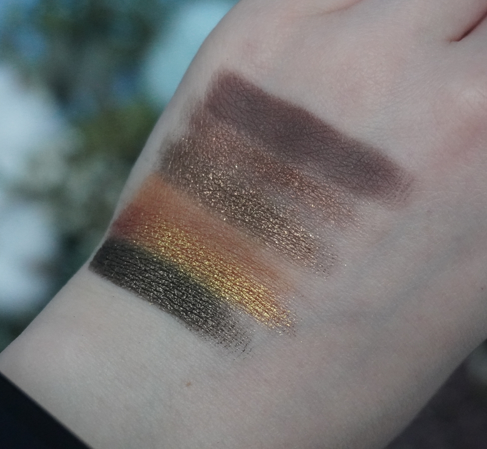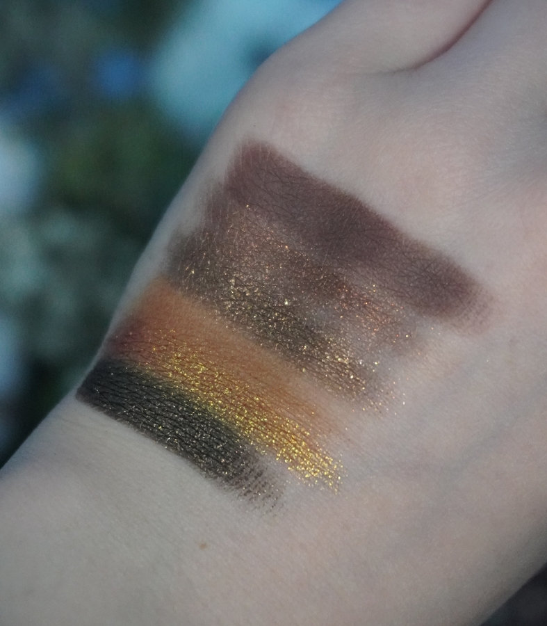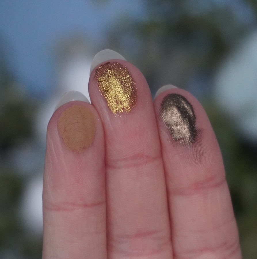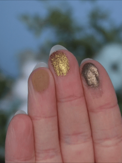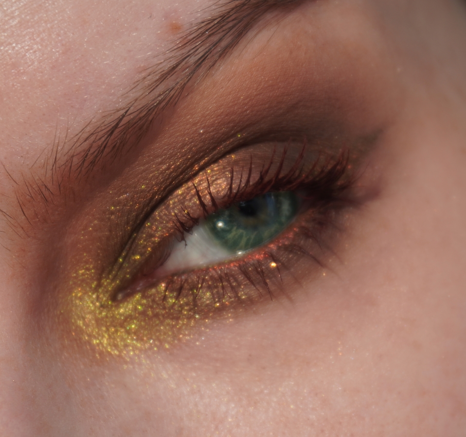 - 030 — основан на оттенке «Затаившая Биение Сердца». Как бы не крутилась, все равно не вижу этого зеленовато-голубого преломления на глазах/руке (вижу только в рефиле). Поэтому для меня это просто красивая и покладистая золотисто-оранжевый шиммер.