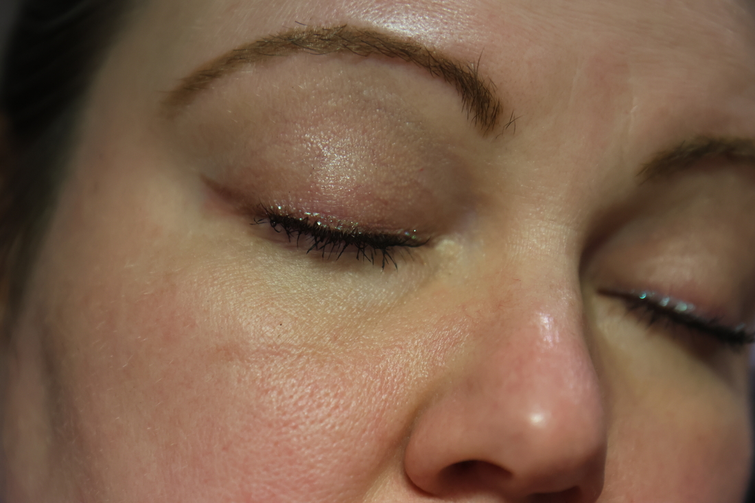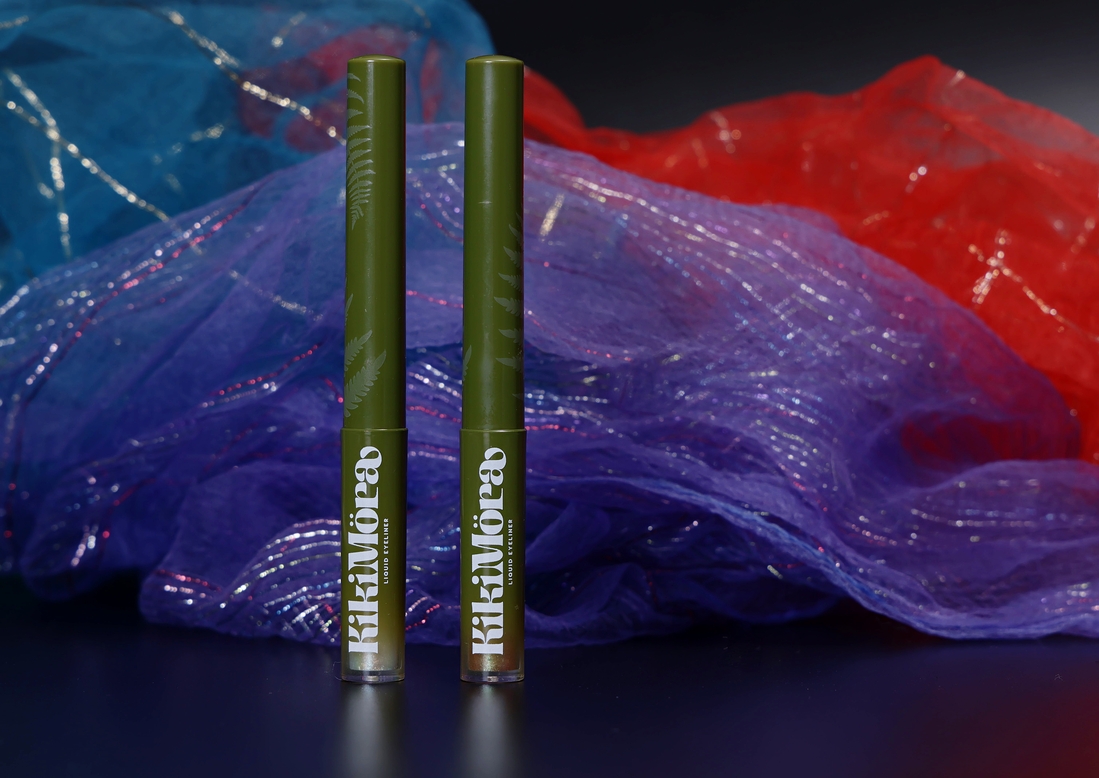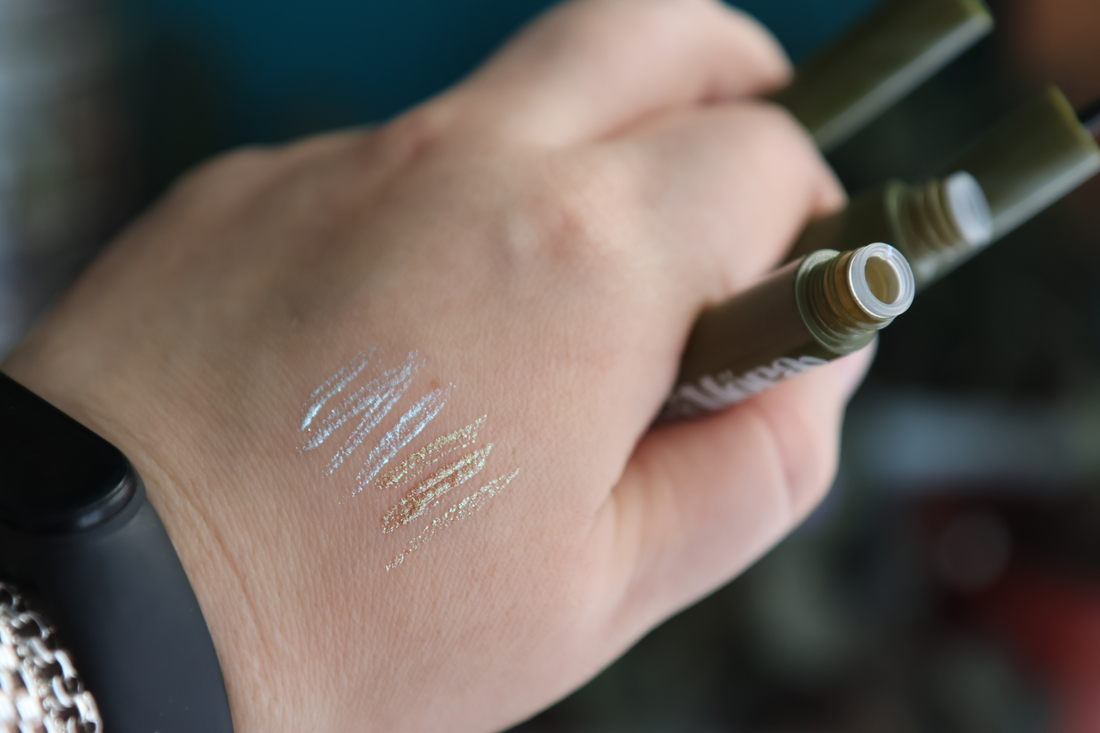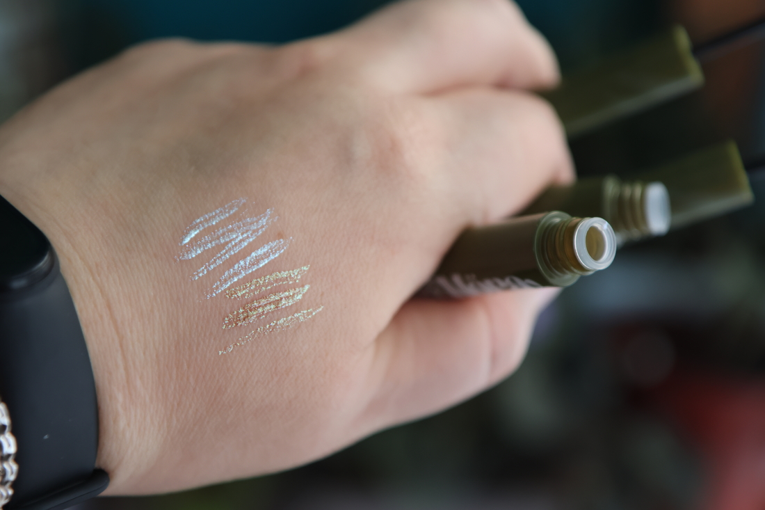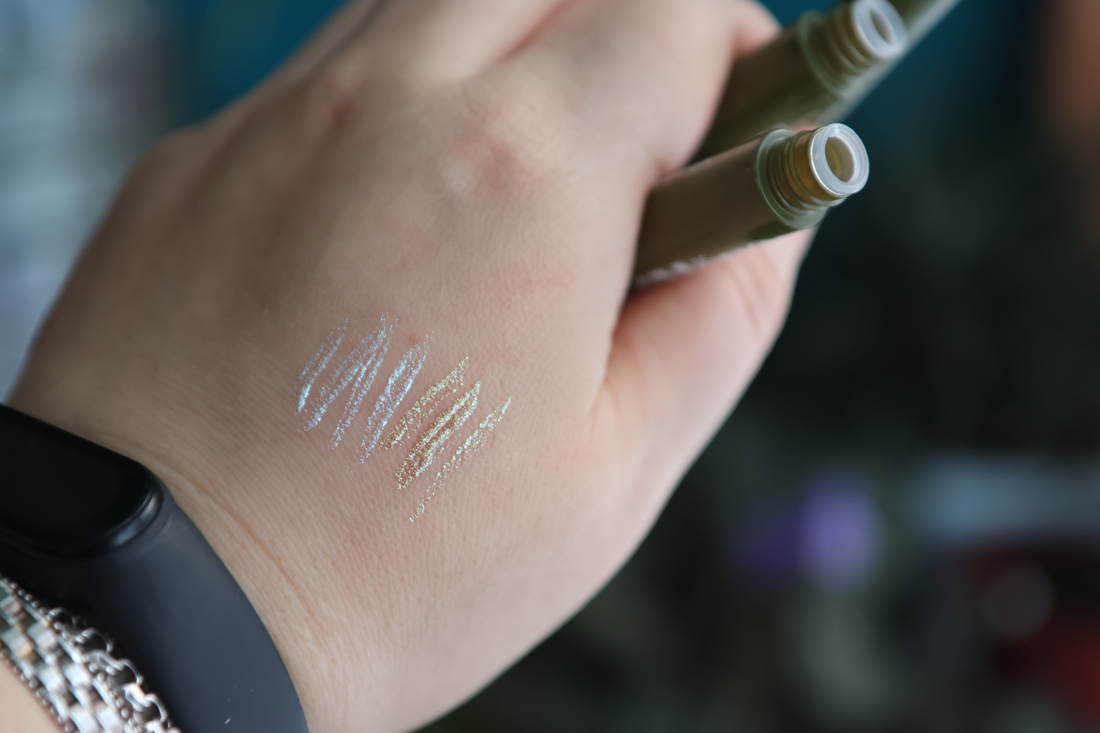 Оттенки-дуохромы. Первый — тут и голубой, и серебро, и даже какой-то намек на фиолетовый. Холодный чистый яркий оттенок. Второй сложнее — тут и бежевый, и зеленый, и намек на розовый что ли. Сложно описать.Но он гораздо более теплый. Но этот более землисто-мшистый, более болотный. Если первый — кивок в сторону огней, которые подчас заводят путников в болото, то второй — уже сама роскошь мшистого ковра под ногами и густой болотной зелени — камни, папоротники и хохочущие русалки. На глазах все это роскошество не так ярко, как кажется, все же подводки полупрозрачные, но довольно любопытные. В расфокусе самое интересное. Возможно их нужно носить не соло, а поверх чего-то, но в обычном дневном макияже сильно придумывать что-то нет возможности, а утром и времени. Поэтому мой максимум — поверх черных стрелок, вторым ярусом.