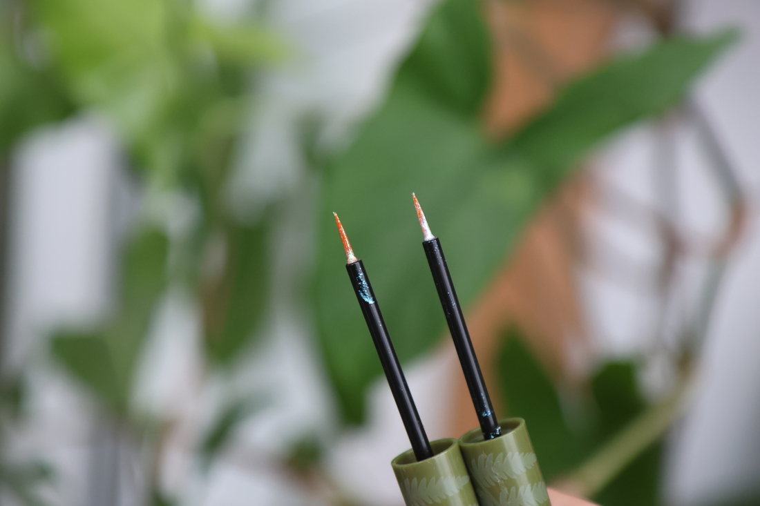 Начнем с подводок, пожалуй. Они очень удобные — флакон и кисть. Идеально! Мой самый любимый формат. Болотно-зеленого оттенка упаковка с папоротником, в самом низу флакона он прозрачен — виден оттенок продукта внутри. Плюс указание оттенка на донышке — 01 (polar lights) и 02 (swampy).