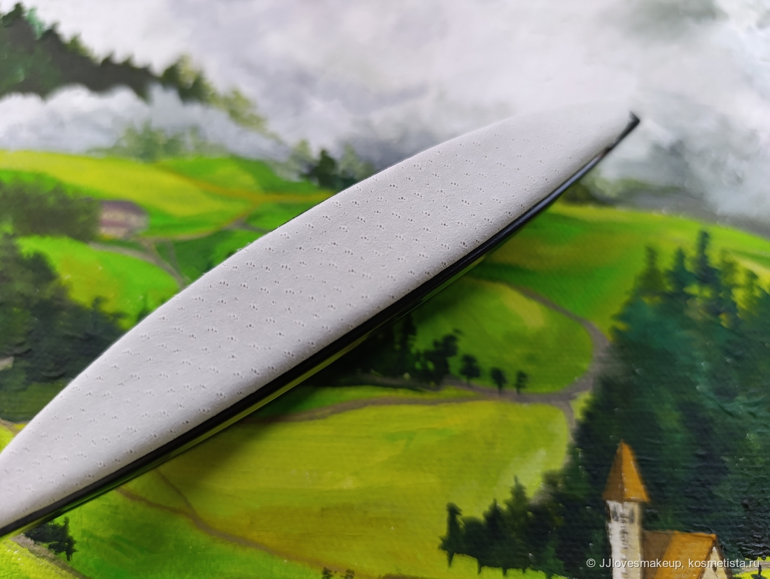 Сам кичин гладкий, из черного пластика, похож на конек (верх выпуклый, низ выпуклый, если поставить на спинку или полировочную поверхность, может покачиваться), заострен с двух сторон, в руке лежит весьма удобно. Сверху украшен золотистым логотипом бренда. Не являетесь уникальным изобретением бренда, но по сравнению с собратьями выглядит как-то надёжнее.
