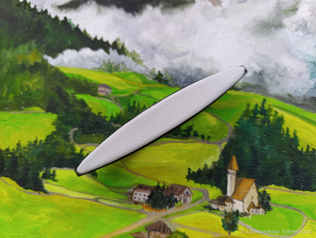 Этот аксессуар представляет собой черный пластиковый «конек» с выгнутой рабочей поверхностью, на сайте написано, что она замшевая. Пластик крепкий, замша в меру мягкая, полирует ногти отлично, в руке кичин лежит хорошо, не пачкается, не царапается, быстро не забивается, ногти не травмирует, кроме того, его можно купить отдельно.