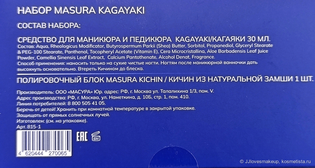 А вот Кагаяки это уже уникальное средство от Масура, которое представляет собой крем для полировки и ухода за ногтями. Бутылочка с ним тоже пластиковая, полупрозрачная, ярко-синего цвета, с серебряной наклейкой по всей поверхности. Сквозь стенки видно само средство. Крышка белая, под прозрачным колпачком.