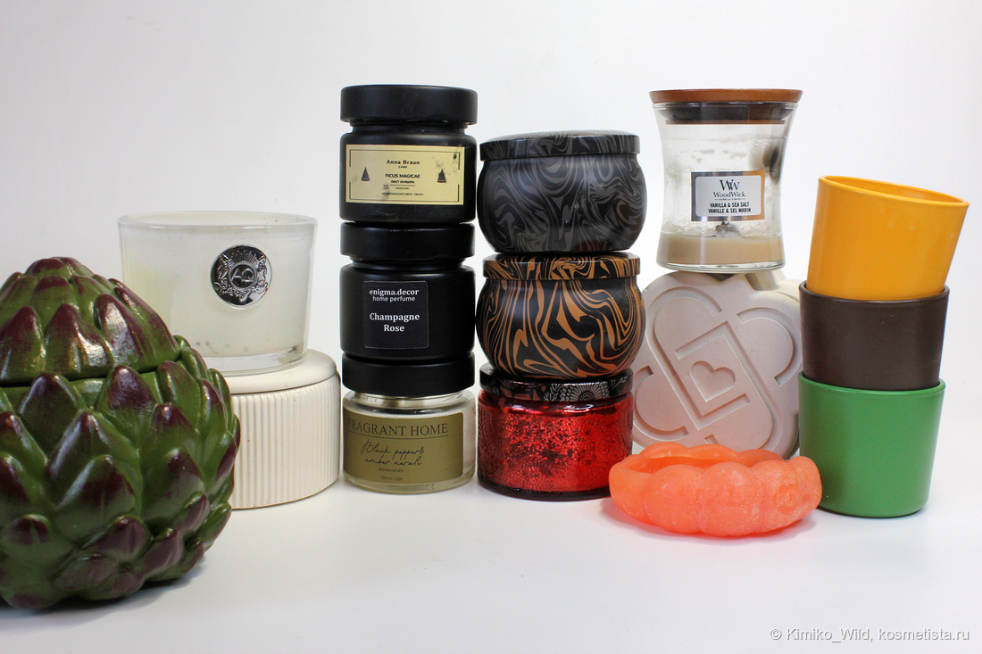 WoodWick с морской солью пахла волшебно, но фитиль оказался закреплен странно, и воска на дне осталось слишком много… Dom Aroma тоже немного огорчили… Подсвечник-артишок и «шкатулка» Laskava уже обрели вторую жизнь.