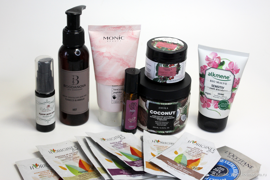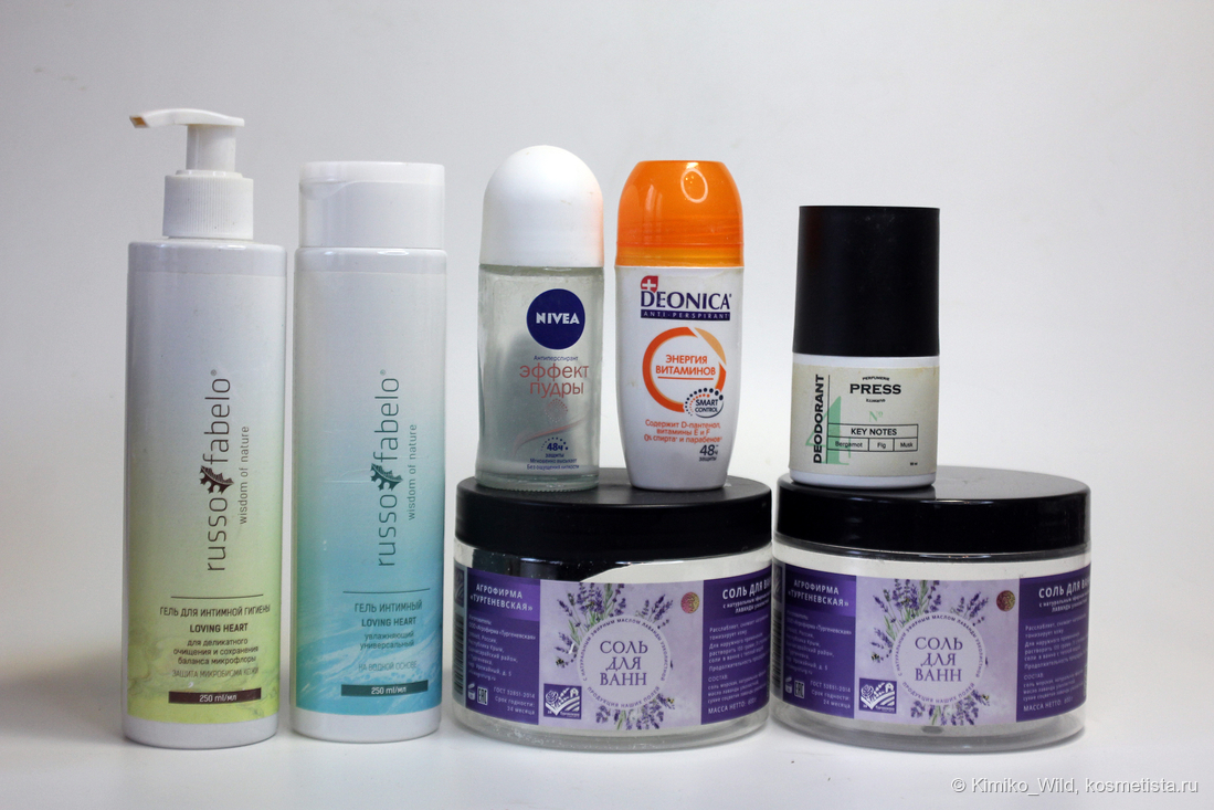 2 геля для душа (а в ходу аж 4…), жидкое мыло (артизанальное, от Анны Вахитовой; бооооже, она так шикарно поработала с ароматом!), твердое мыло (7 шт., суммарно 700 гр – снова перебор с учетом того, что кусковым мылом я мою только руки…), 2 скраба для тела, 2 интимных геля (это были эксперименты Russo Fabelo, слабенькие, скажу прямо…), 4 соли для ванн (2 пустые банки стали контейнерами для отправки коллекционных хрупких стеклянных стаканчиков – сама не предполагала такую вторую жизнь для этих емкостей…), крем для тела (+9 пробников-саше), 5 кремов для рук, косметическое масло (я его использовала для кутикулы и ногтей, хотя оно многофункциональное), 3 дезодоранта (люблю именно «шарики»). И тюбик крема для депиляции – вынужденно вернулась к некогда любимому «Батисту»: дешево, сердито, хорошо удаляет даже жесткие волосы, но не воняет едкой химией в отличие от Veet.