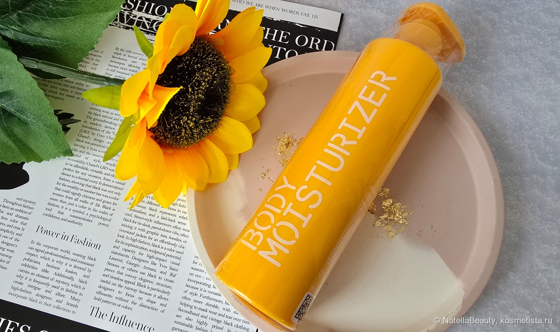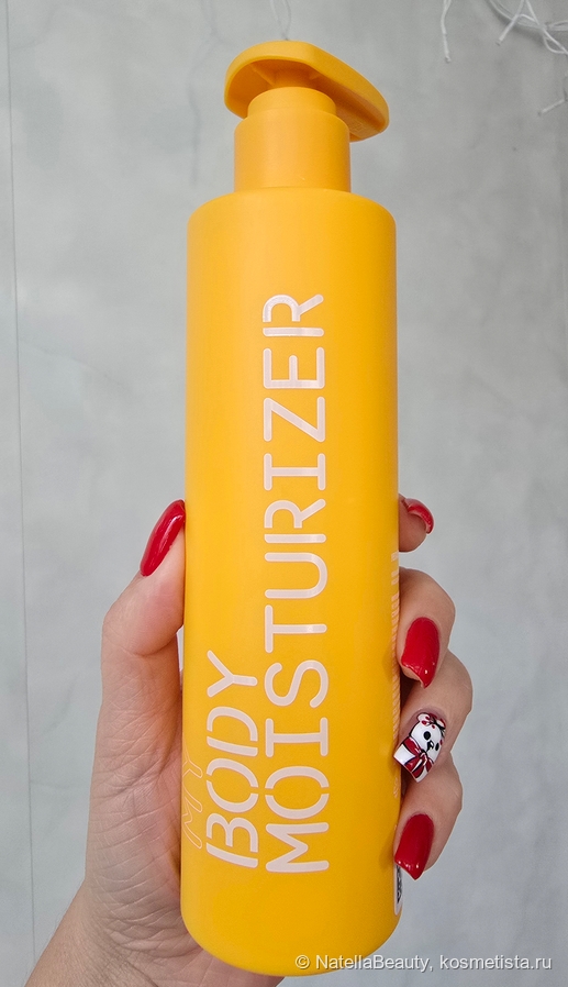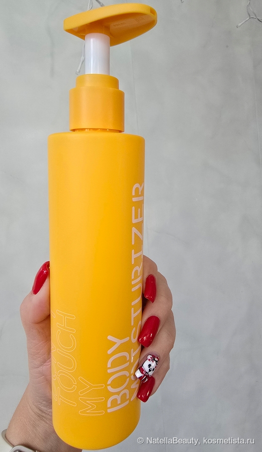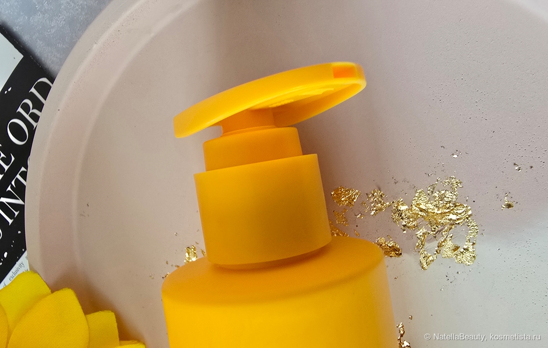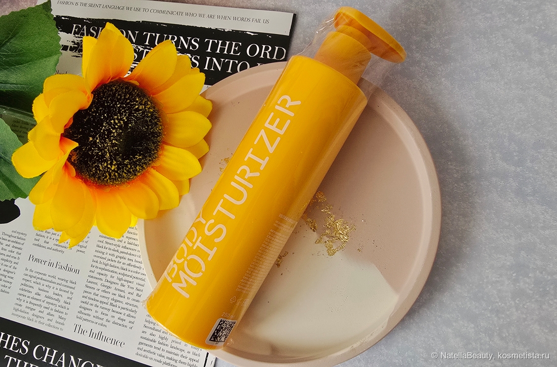 Крем для тела находится в ярко жёлтой пластиковой бутылочке и оснащен дозатором. Бутылочка матовая, яркая, стильная и приятная на ощупь.