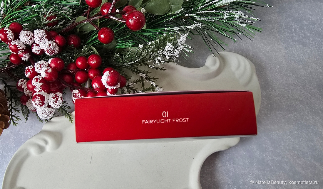 Хайлайтер упакрван в красивую картонную коробочку белого цвета с переливающейся 3d снежинкой. Выглядит все очень красиво и по зимнему. Крышечка и задняя стороны коробочки выполнены в красном оттенке.