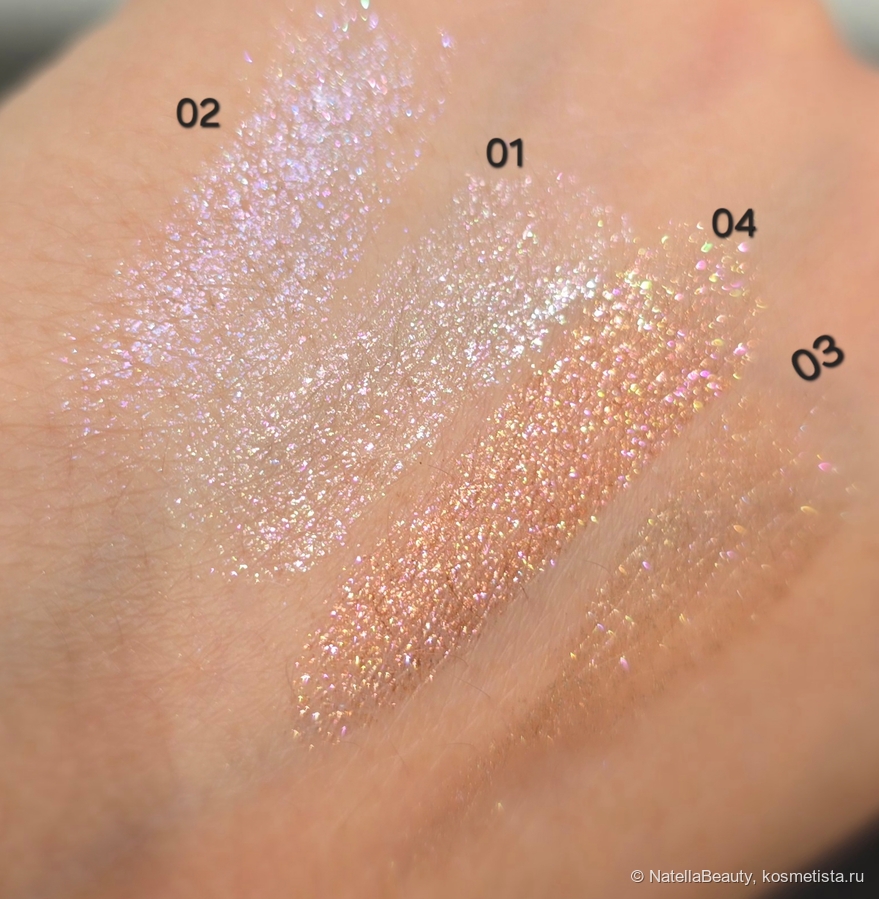Оттенок 02 Iced Caze — не такой насыщенный серебряный как в стике. Это россыпь голубых, розовых и серебрянных блесток и мелких слюдинок на прозрачной базе. Невероятно воздушно и красиво!