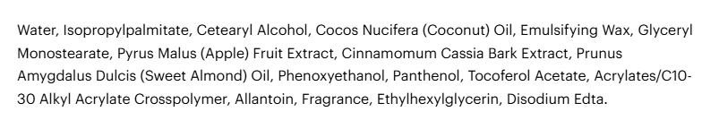 Аромат из тубы звучит приятно — средство пахнет яблоками с ванилью и корицей. Но на коже отдушка становится химозной и раздражающей. Вообще, я любительница подобных «съедобных» ароматов, но в данном случае он меня напрягает.