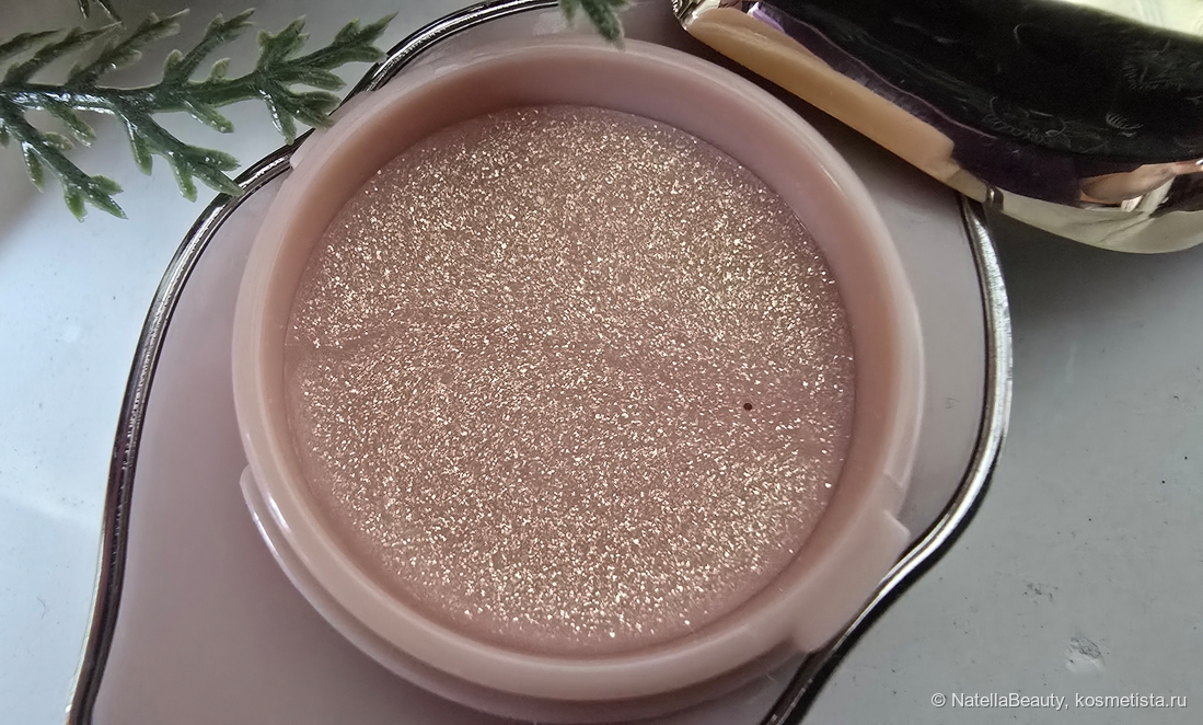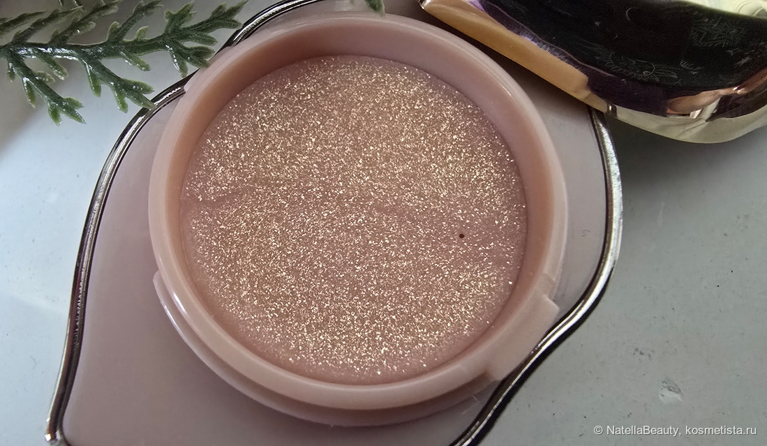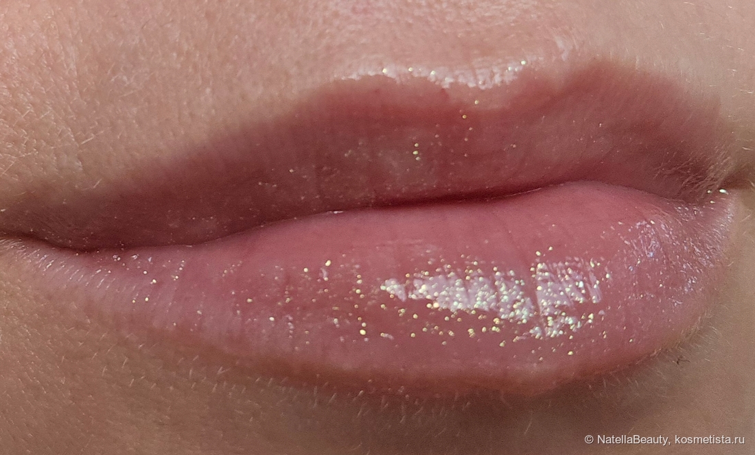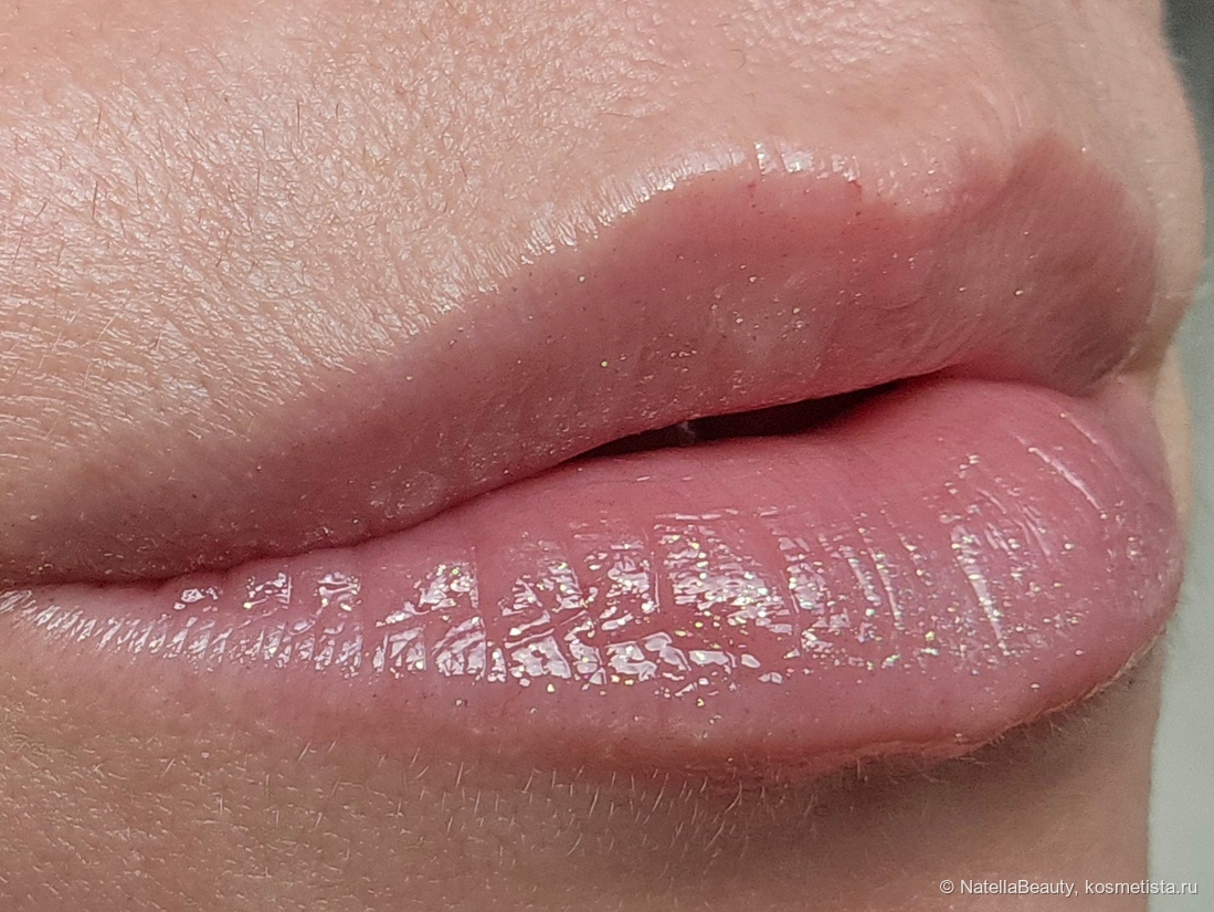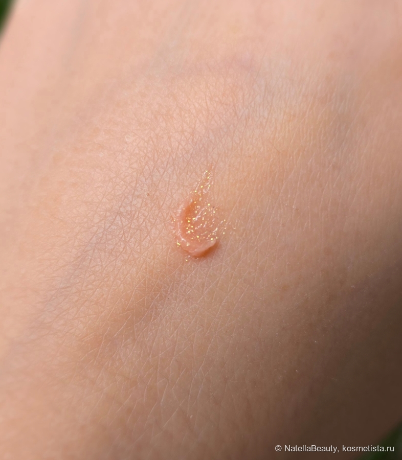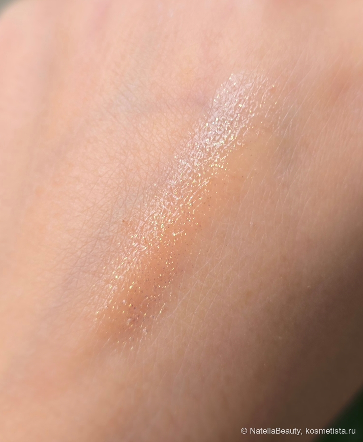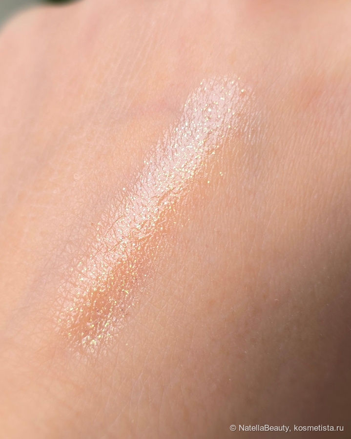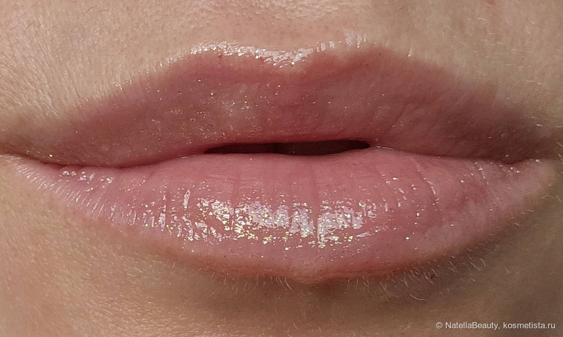 Бальзам представлен в единственном оттенке. Это светло-розовая натуральная база, практически полностью прозрачная, с мелким золотыми шиммером. Оттенок розового здесь теплый, натуральный, ближе к персиковому. Не выбеливает губы (мне это важно).