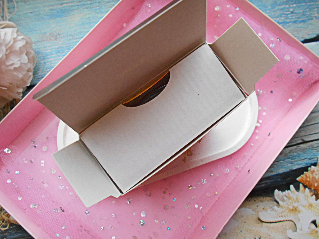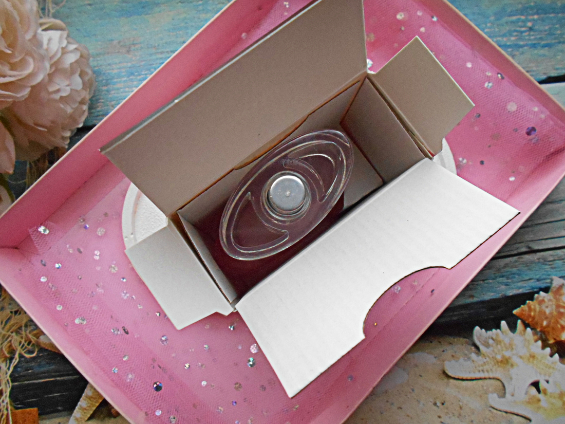У меня объём 50 мл. Коробка картонная, приятного розового цвета. Сверху была защитная слюда.