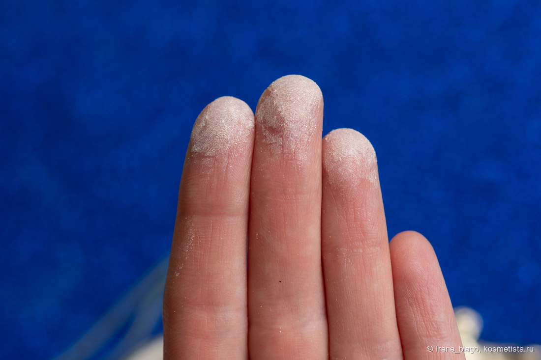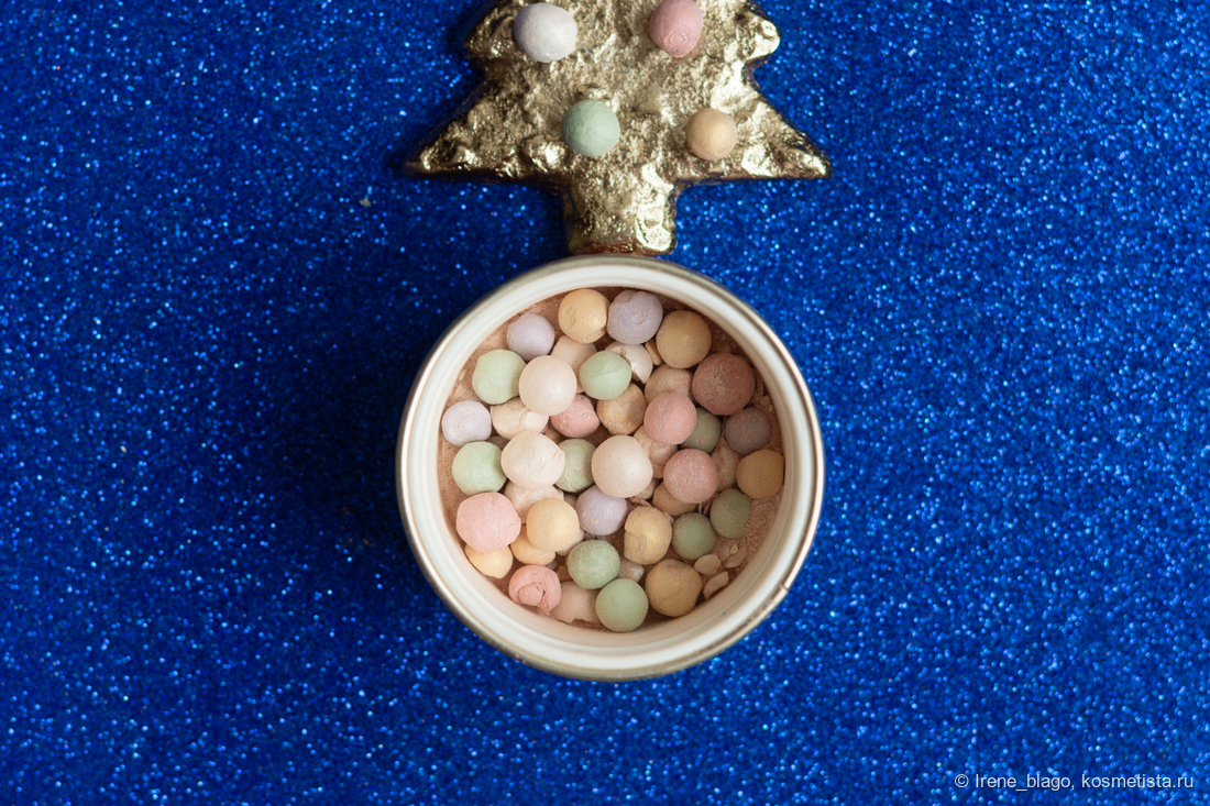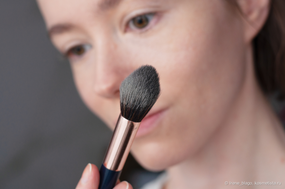 Для более активной передачи на фото, я нанесла пудру теми остатками мельчайшего помола, находящимися на дне банке. Такое нанесение дает ярко выраженный сияющий эффект с подчеркиванием текстуры кожи, поэтому чтобы не делать так сильно акцент для области с расширенными порами, в обычной жизни наношу пудру касаясь кистью шариков.