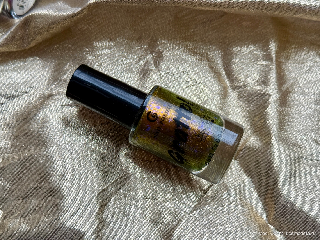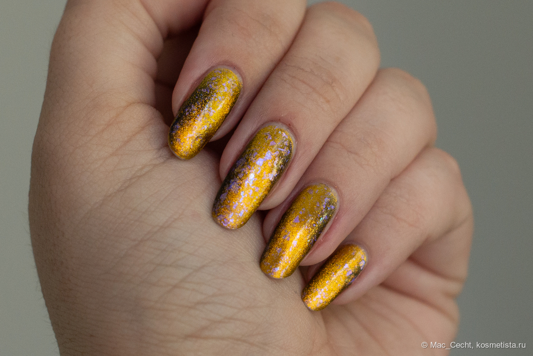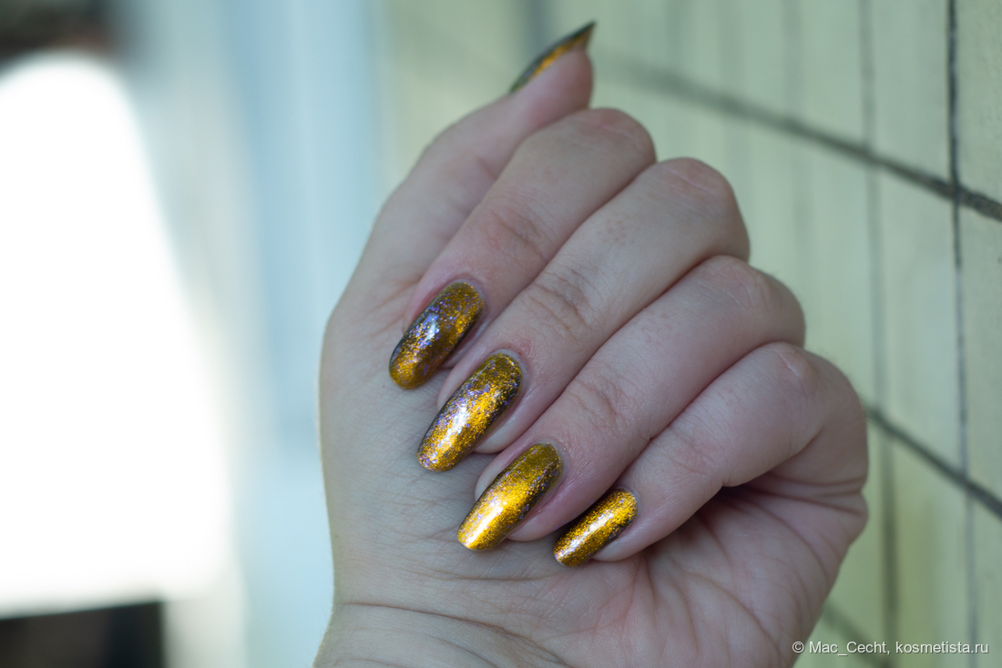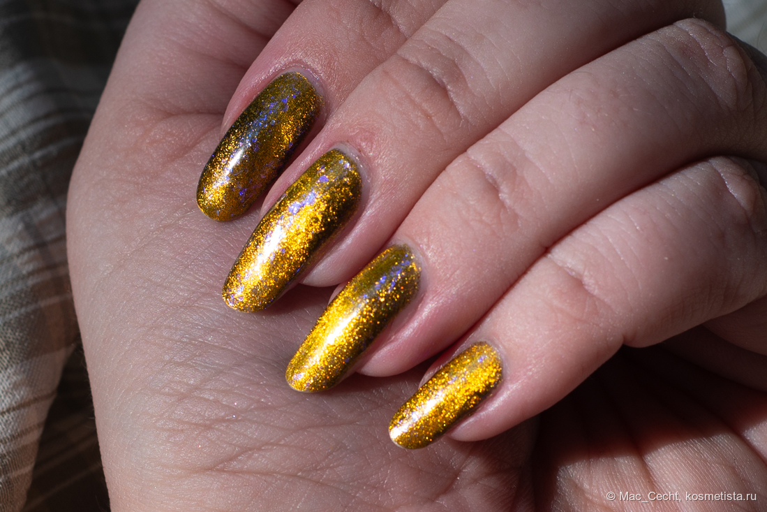 Это что-то нереальное. Этому лаку нужен свет, желательно, солнечный, тогда он будет максимально эффектный и красивый. Вот эта золотая начинка становится такой яркой, как нарисованной...