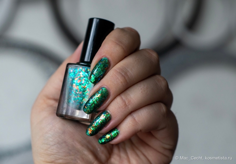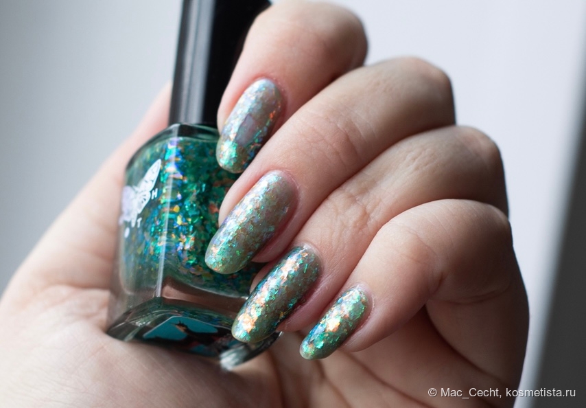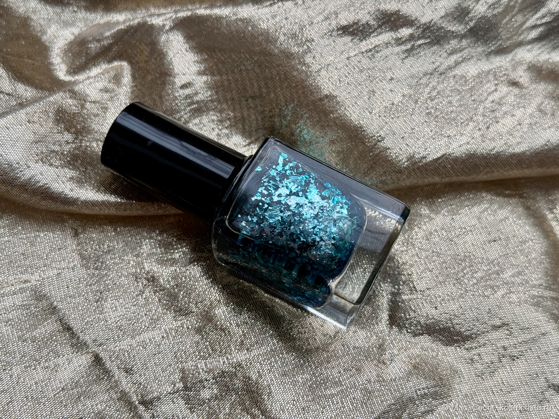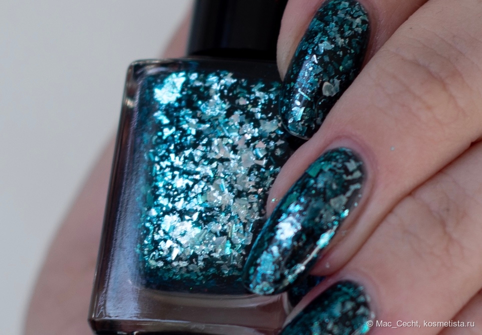 Не самый яркий лак в моей коллекции, но я им покорена — тиловая база (иногда уходит в синеву) и яркая серебристая слюда под слоем цветного желе.