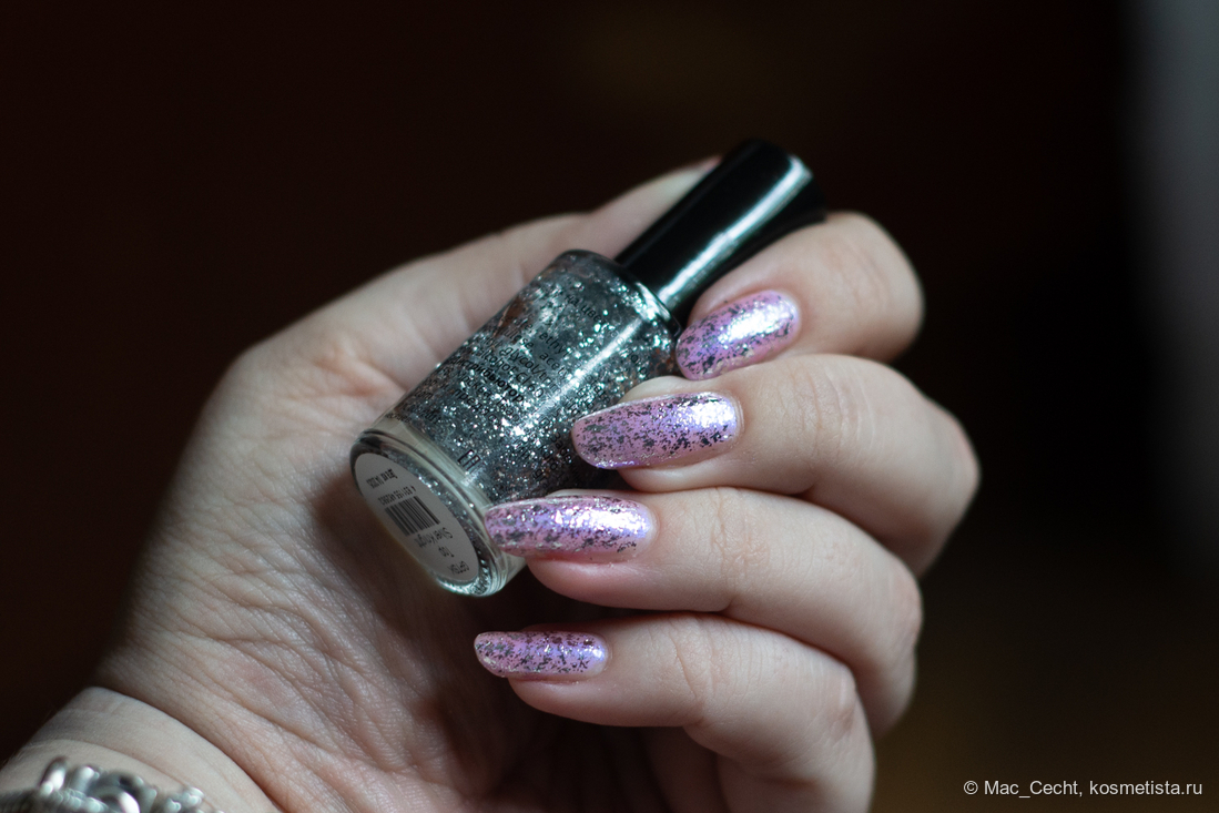 Во всей серии хорошая начинка, не три блестки, но в серебре она еще и яркая, например, красная фольга не выглядит так ярко, хотя тоже металлик.