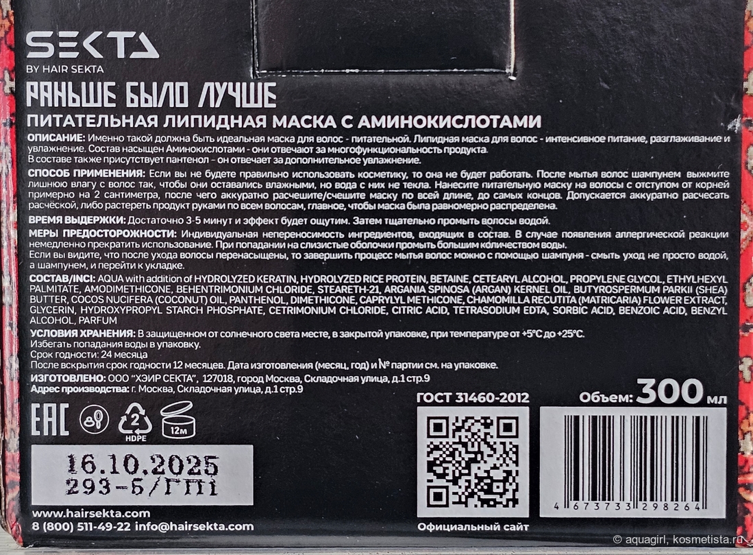 Состав маски «Раньше было лучше» насыщен аминокислотами и липидами для питания, разглаживания и увлажнения волос.