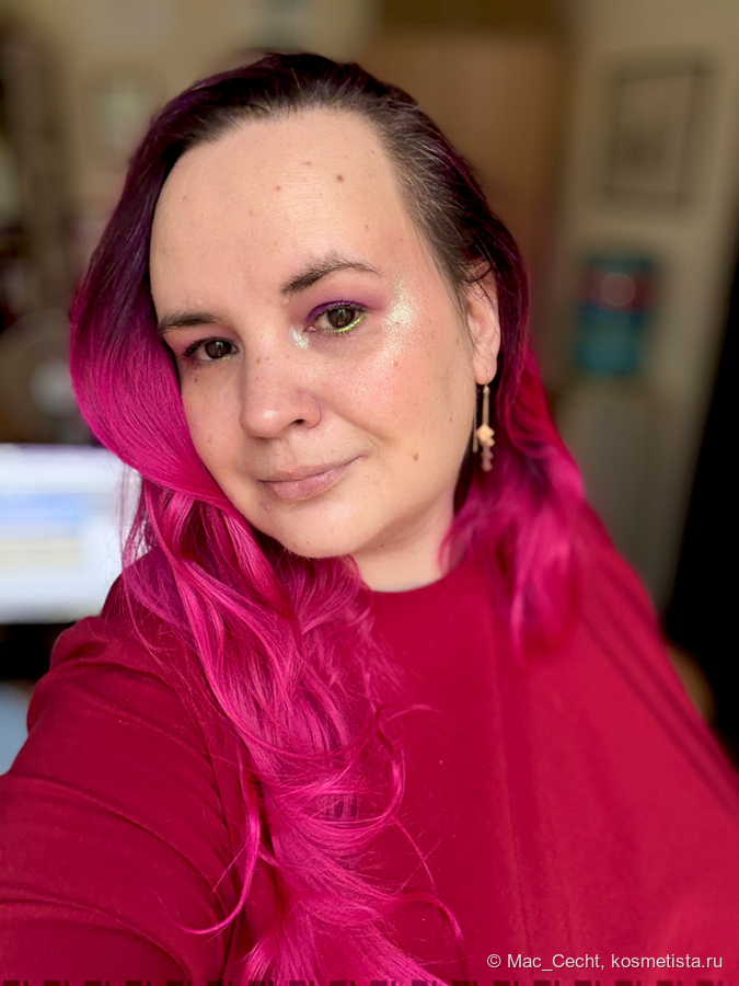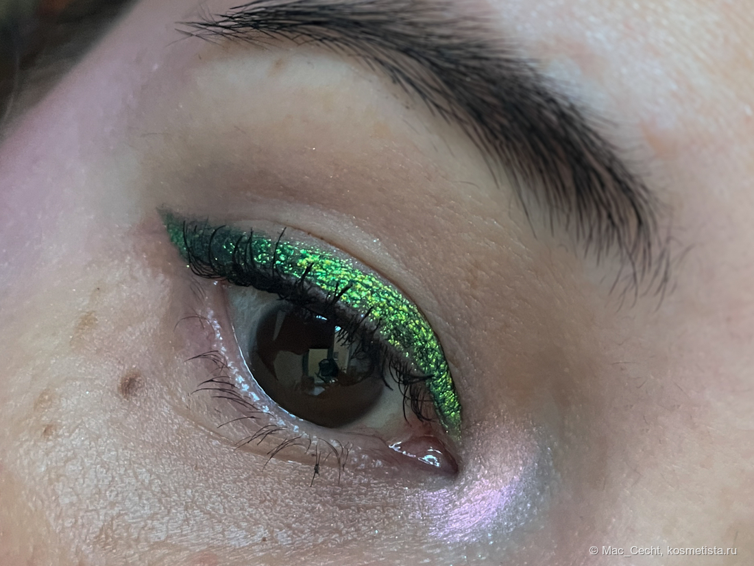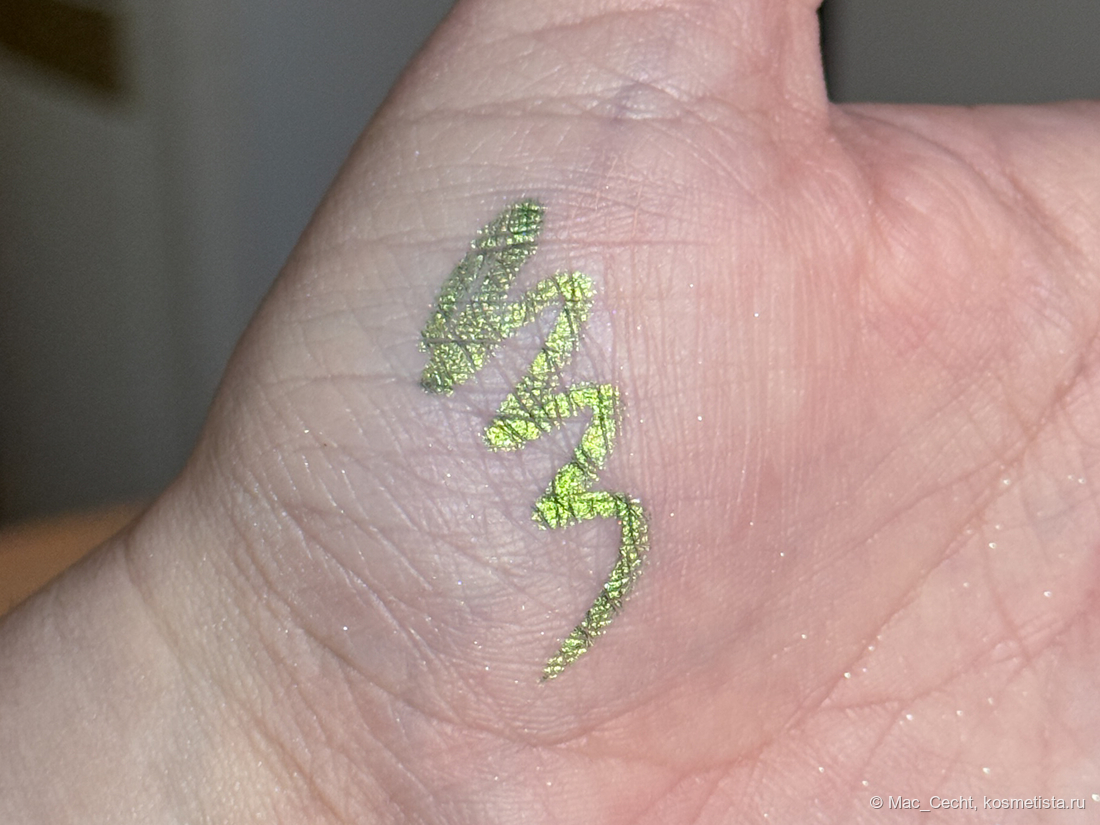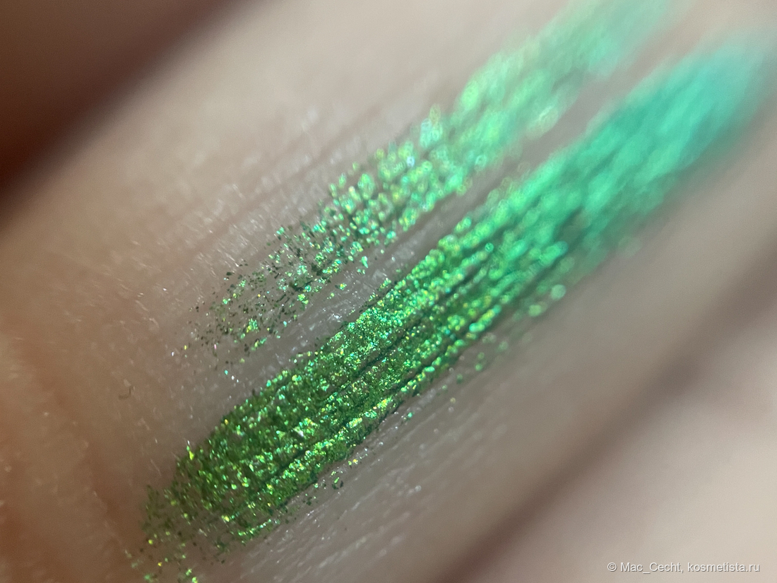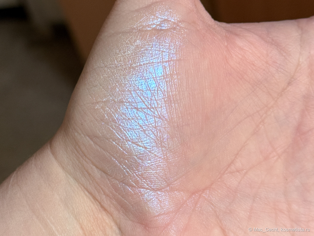 Это блесточный хайлайтер, никакой естественности и незаметного блика, не мечтайте. Цвет — зеленый, прохладный, типа мятного. А еще он мультихромит в розовый и голубо-фиолетовый…