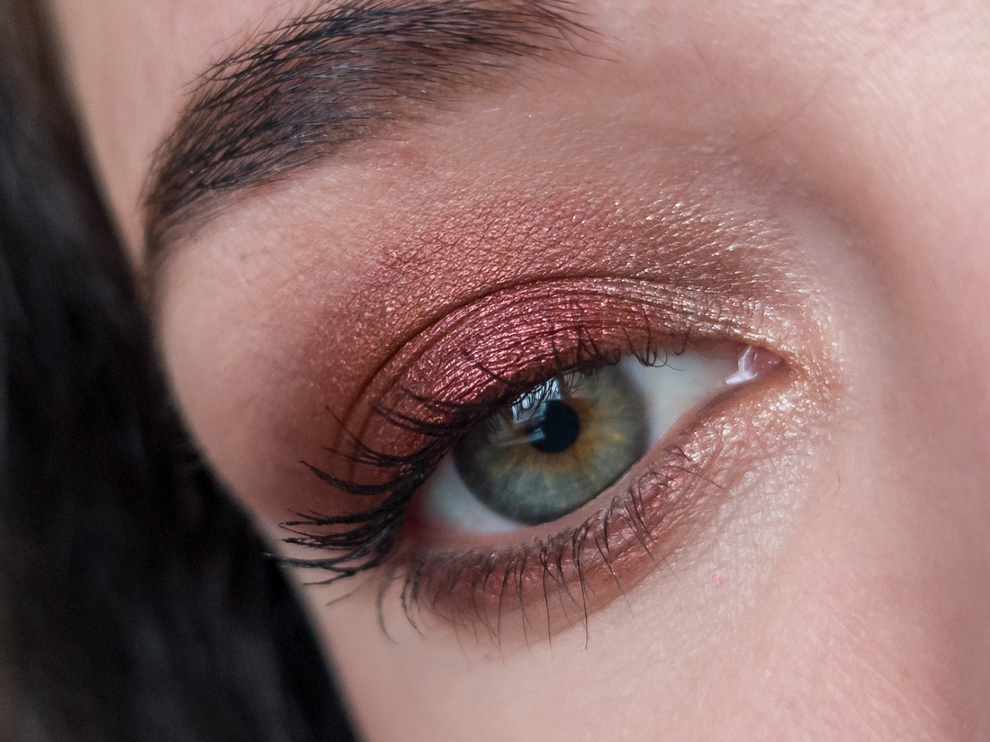Красновато-коричневый шиммер на серо-коричневой базе, напоминает мне вулканическую лаву. Этот оттенок уже заметно осыпается, поэтому макияж глаз с ним лучше делать до тона. Но зато пигментация у него роскошная, покрытие получается плотным, однородным и ярким. Самостоятельный, не требует ни стрелок, ни затемнения в уголке, и без всего этого тени выглядят красиво, не плоско и динамично.