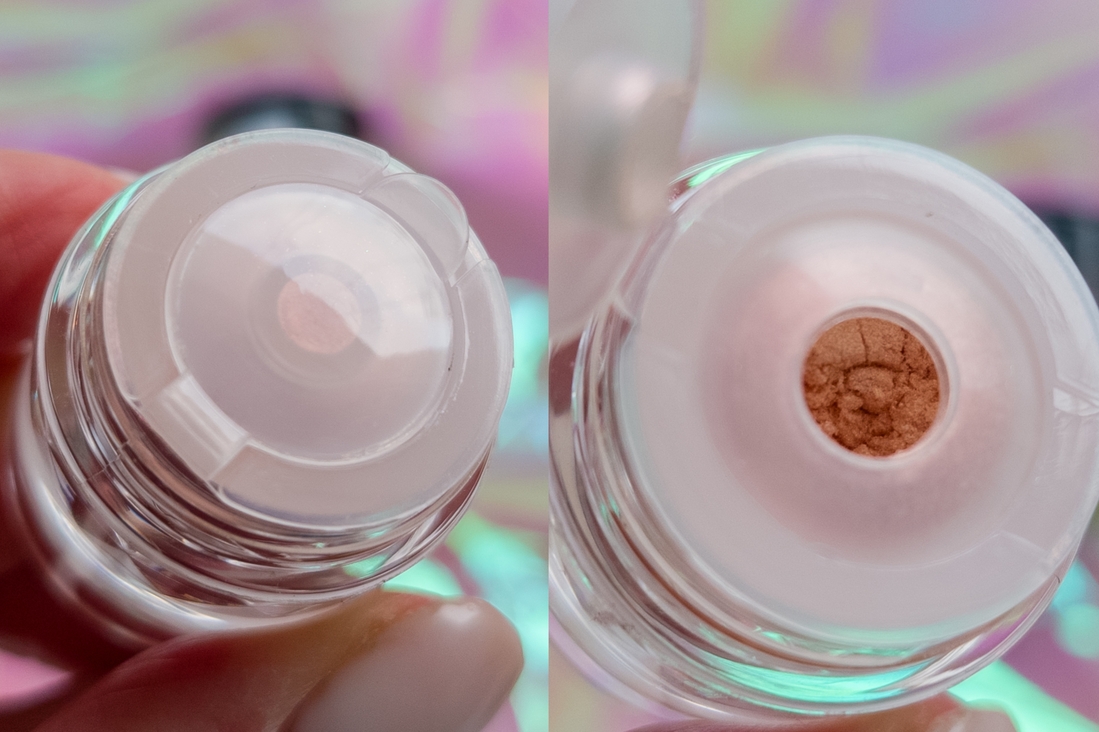 Я не большой фанат рассыпчатых продуктов, потому что пока откроешь, наберёшь, все содержимое будет у тебя в воздухе и на туалетном столике. Но здесь предусмотрен клапан с маленьким отверстием, который в общем то, неплохо отрабатывает свою функцию. Открыла, пересыпала немного теней в крышку и все чисто.