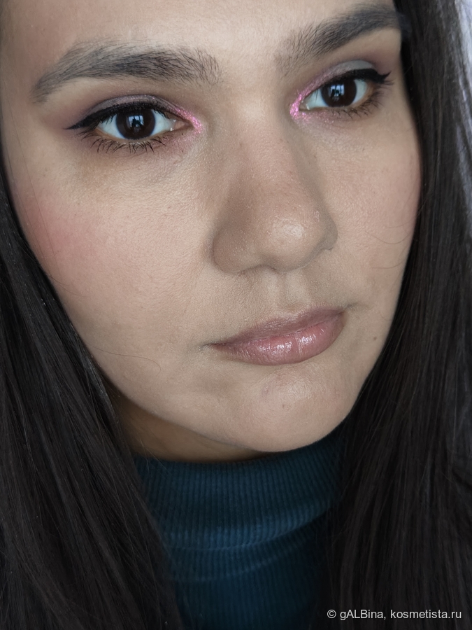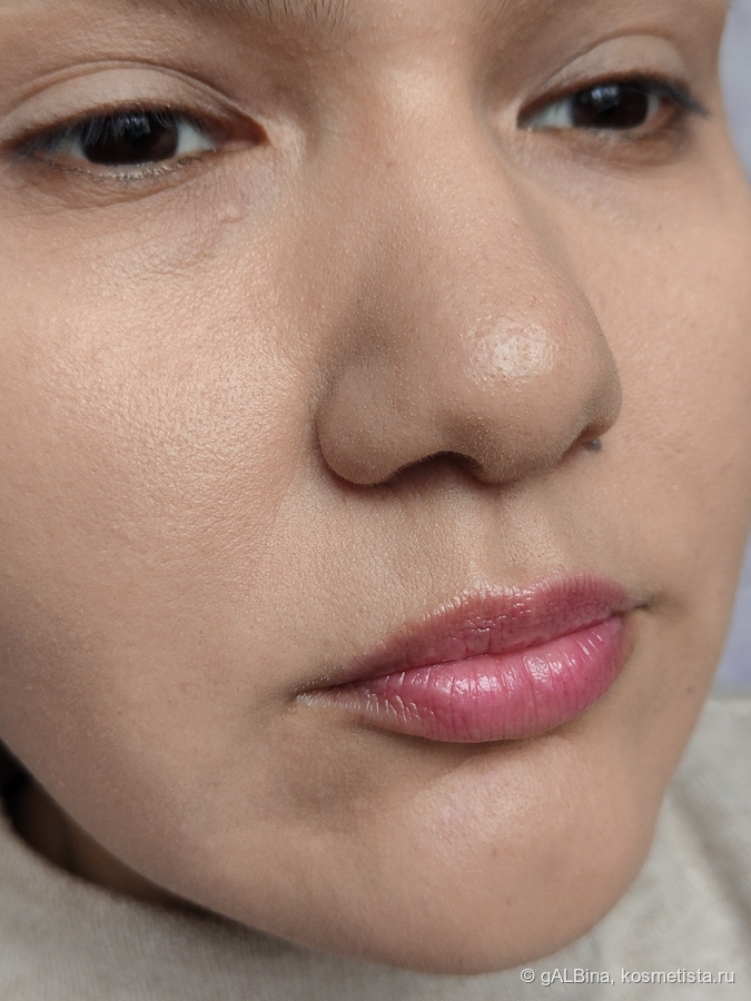 На губах выглядит выбеливающе, блёстки особо не заметны, за контур не затекает. И к тому же довольно стойкий для блесков, есть уходовый эффект.