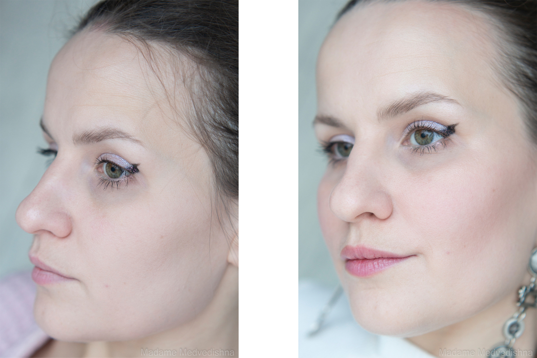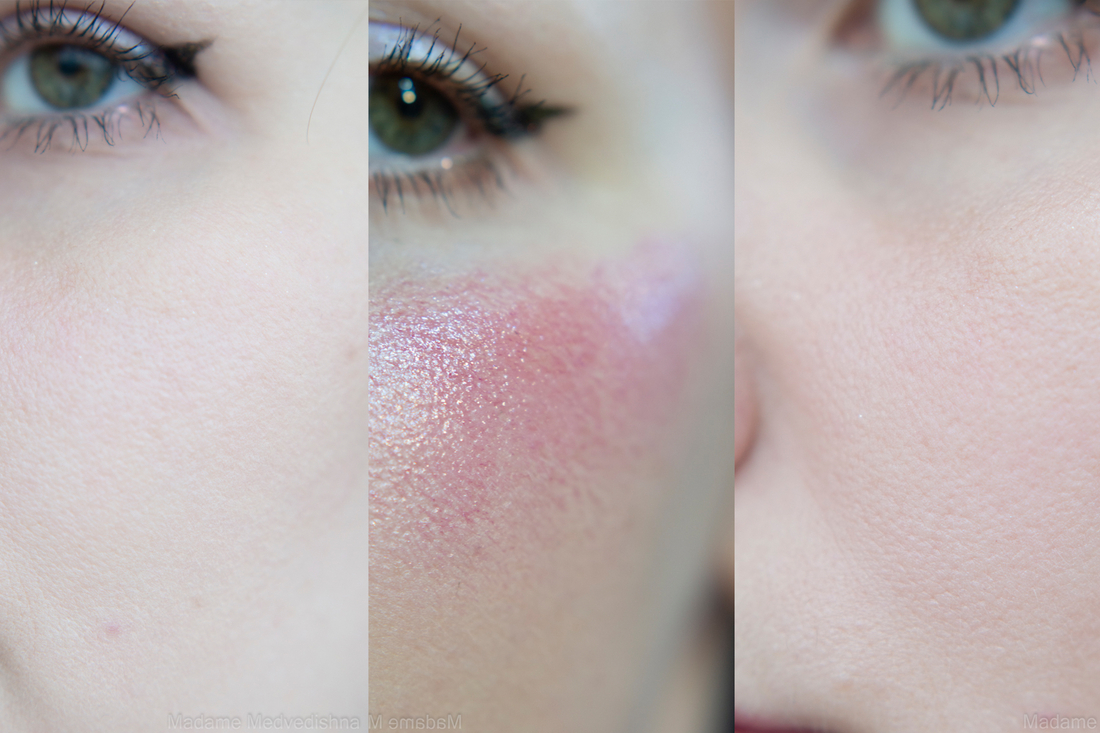 На щеках оттенок лёгкий, уводится в кожу очень хорошо, смотрится деликатно, в поры не западает. Финиш матовый, без малейшего сияния.