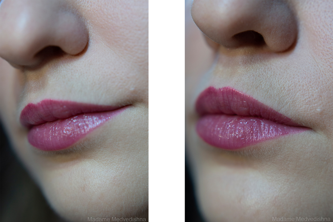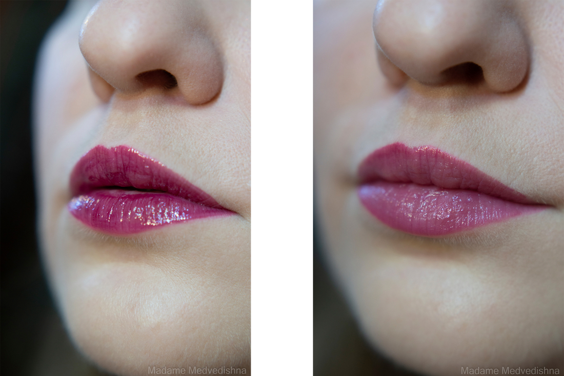 После нанесения тинта на губы я жду минут 5-10 и промакиваю губы салфеткой. После промакивания цвет получается равномерный, смотрится натурально и аккуратно, удачно подчёркивает форму губ.
