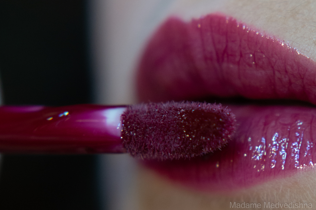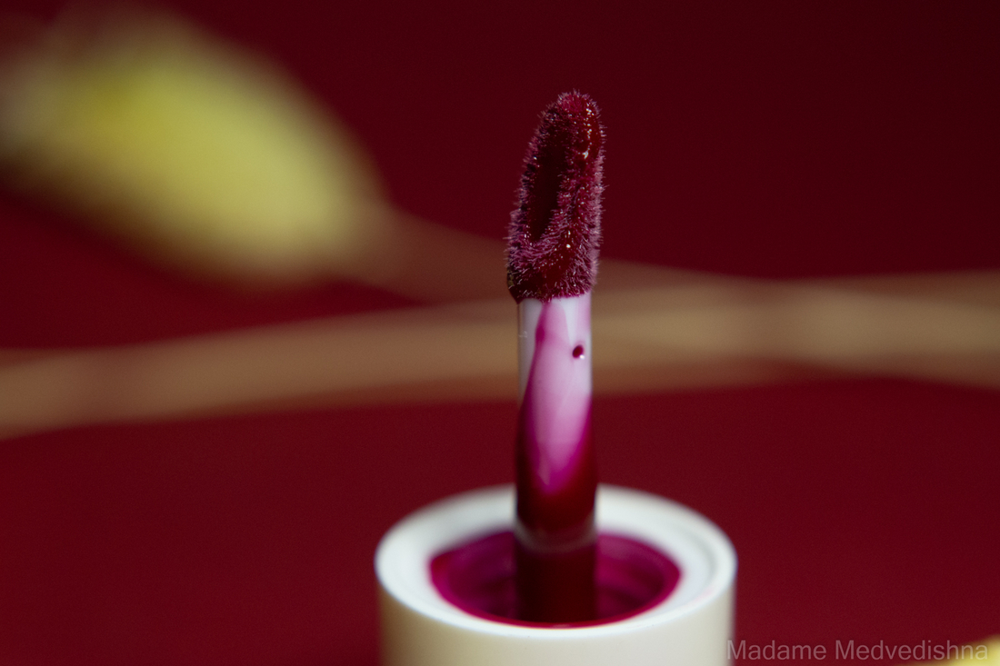 В центре небольшое углубление. Аппликатор довольно удобный для нанесения, им можно как нарисовать контур, так и заполнить всю поверхность губ. Одного окунания достаточно для нанесения тинта на все губы.