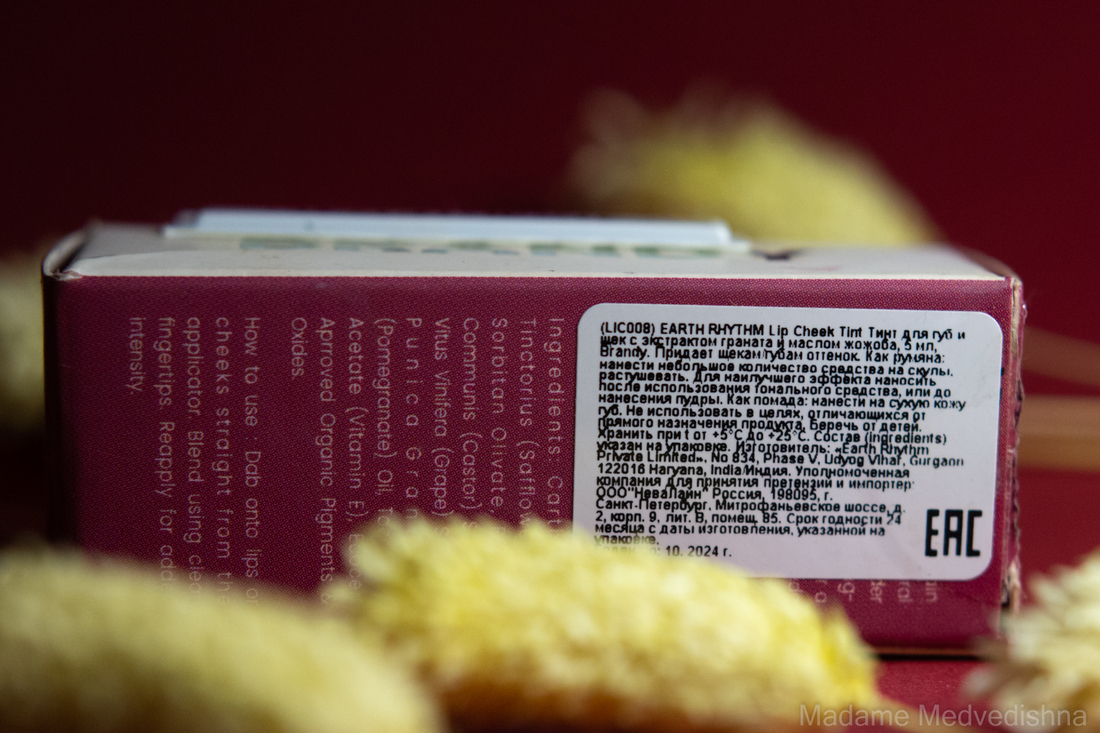 «Lip cheek tint» от Earth Rhythm неплохой продукт, я не пожалела, что приобрела его. Как средство для губ середнячок, цвет очень красивый, но стойкость для тинта маленькая.