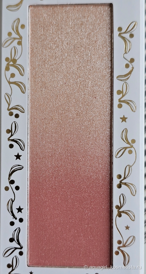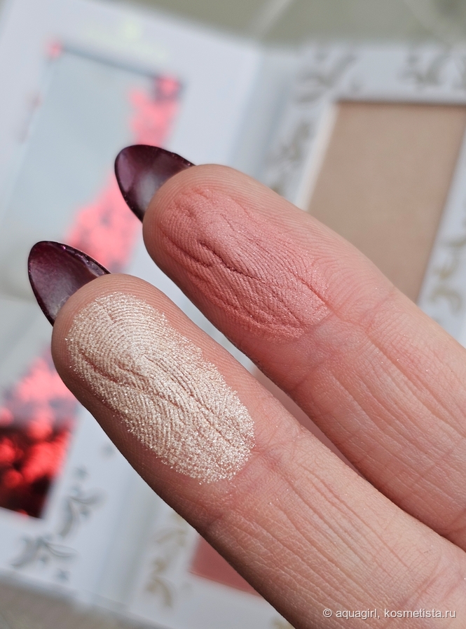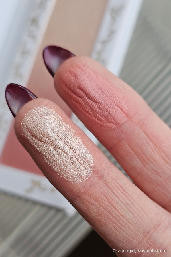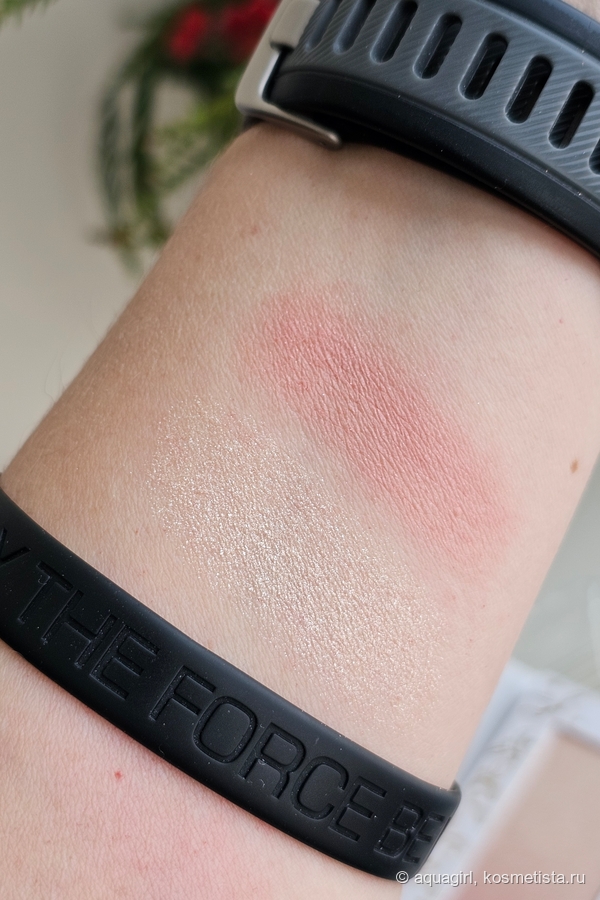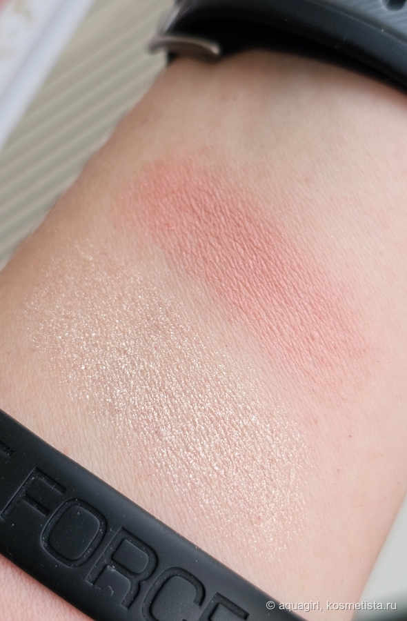 Хайлайтер светло-золотистый, с заметными сияющими частицами. Румяна розовые, в упаковке кажутся значительно чуть темнее, чем на свотчах и в макияже.