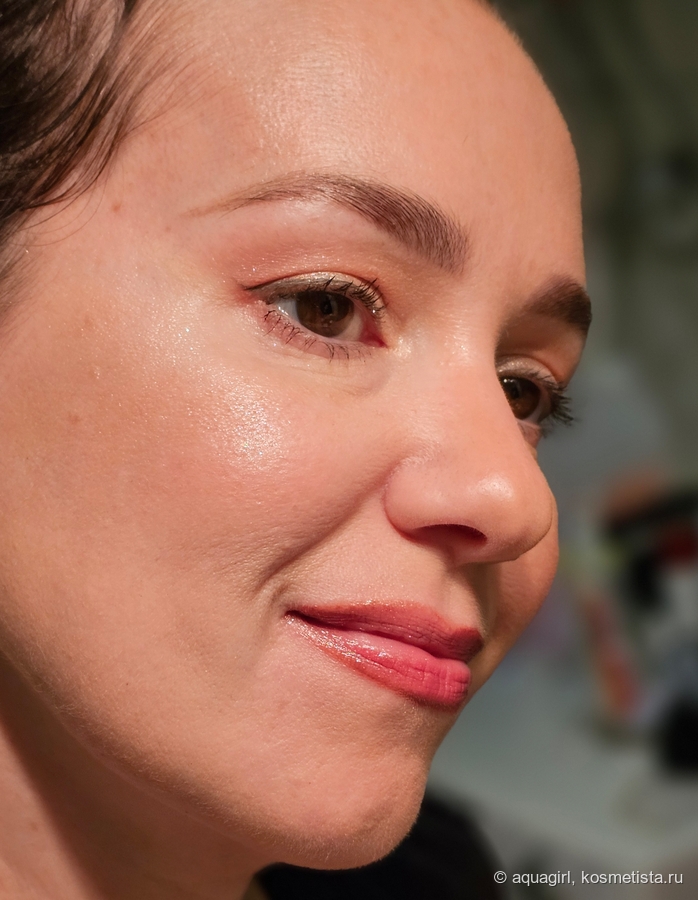 И при искусственном освещении лучше виден сияющий блик и отдельные блёстки хайлайтера.