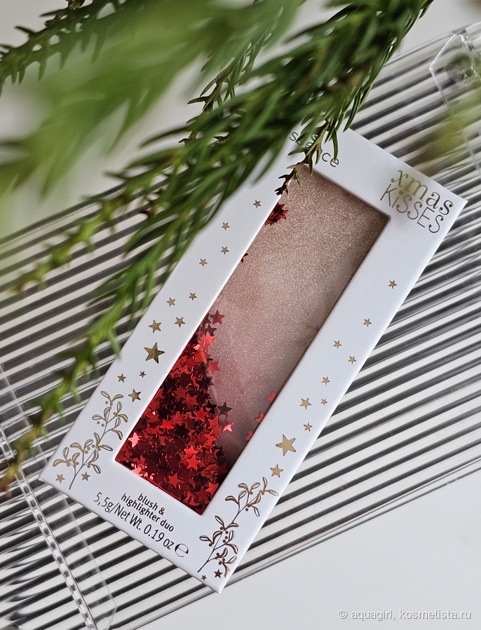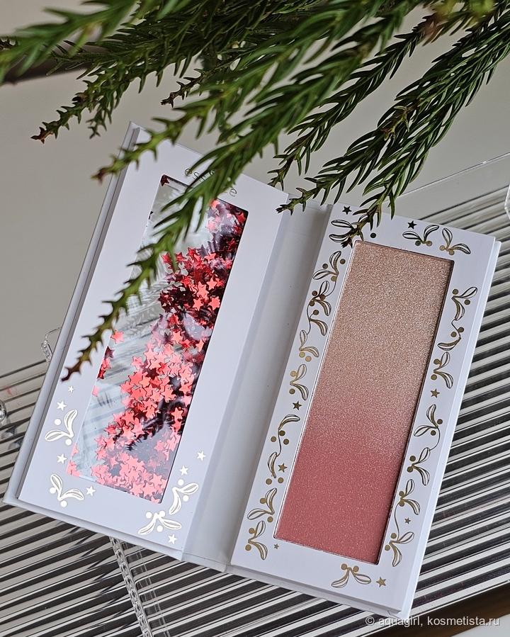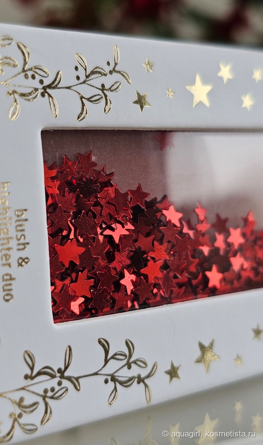 Упаковка очень красивая и праздничная. В коробочке сделано прозрачное окошко, в которое засыпано большое количество блестящих красных звёздочек. Глиттер свободно перемещается по внутреннему пространству и забавно шуршат.