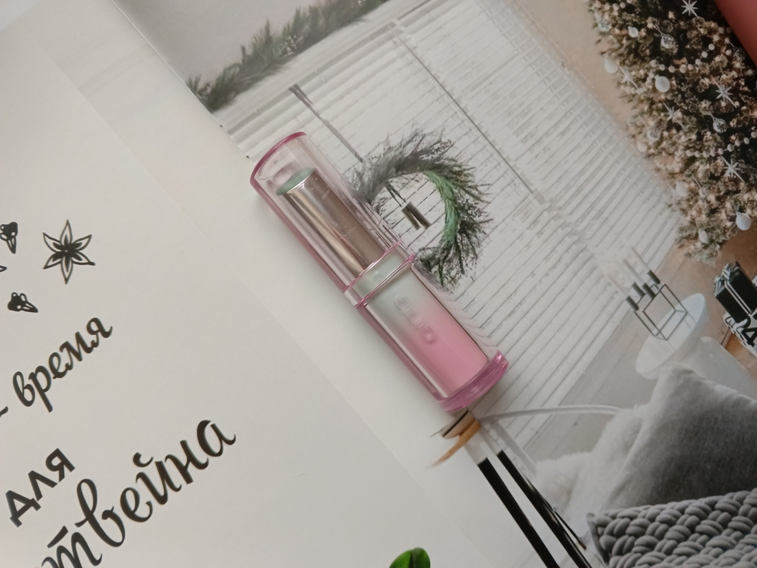 Это бальзамная помада с классным оформлением. Прозрачный увлажняющий стик в котором утоплено огромное количество крупной слюды. А в центре звездочка из пигмента, ярко-розового соответственно. В итоге получается эффект тинта, чуть размытый, не самый яркий, но стойкий. Я конечно больше люблю эту помаду за оформление, но искренее радуюсь покупке, потому что каждое ее использование дарит массу положительных впечателний из-за ее праздничного внешнего вида.
