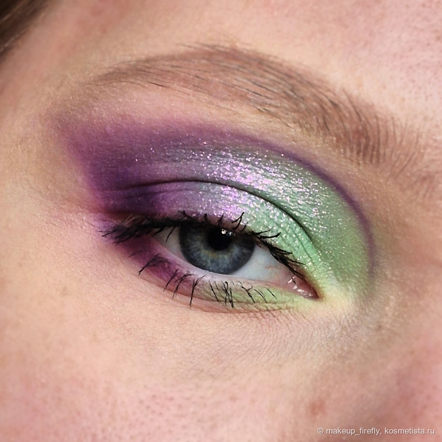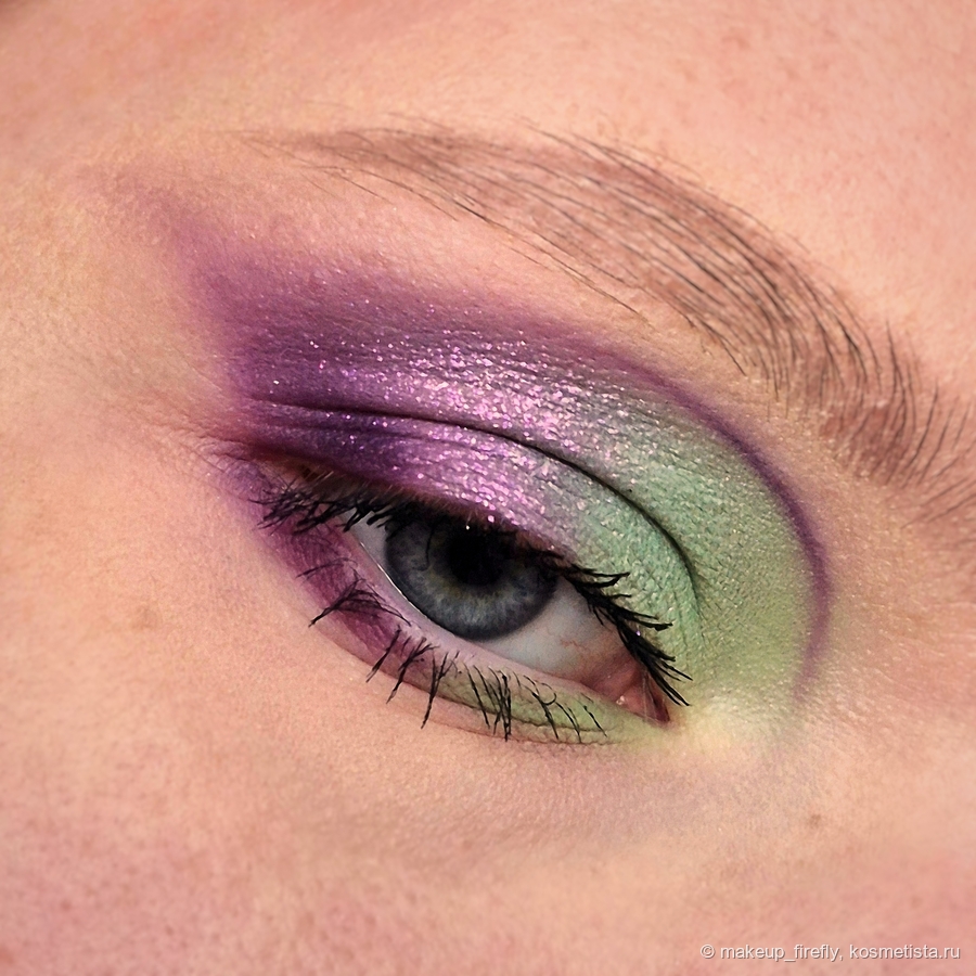 В этом макияже решила соединить зелёный и два матовых фиолетовых, а поверх уже нанести туберозу. С тушевкой фиолетовых у меня возникла сложность, ну вот никак оттенок Petal не хотел соединяться со Scabish. Я уже начала сомневаться в своих навыках, но, чуть подольше посидев, у меня вроде получилось сделать место соединения не грязным.