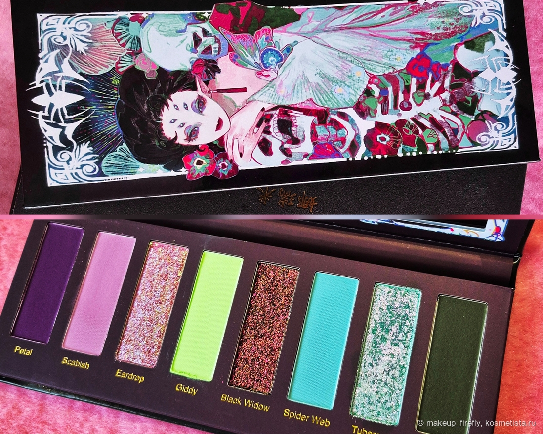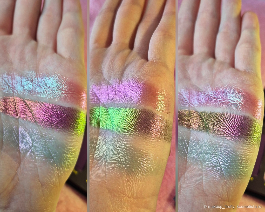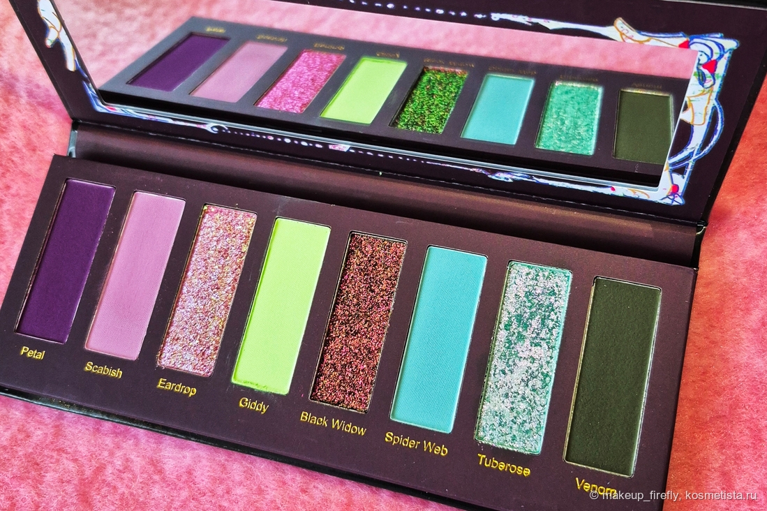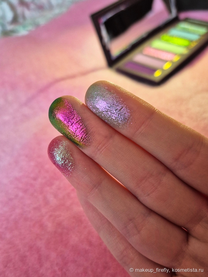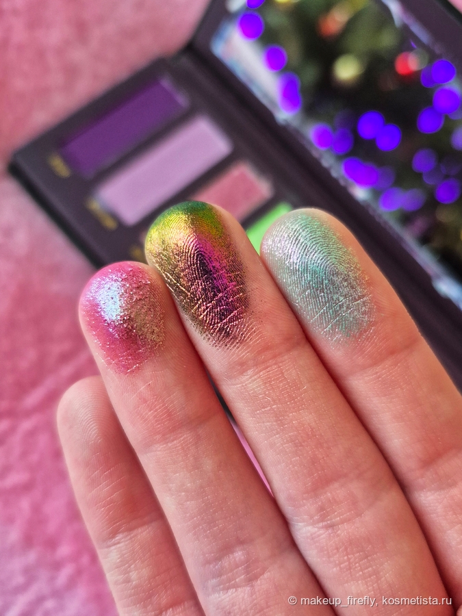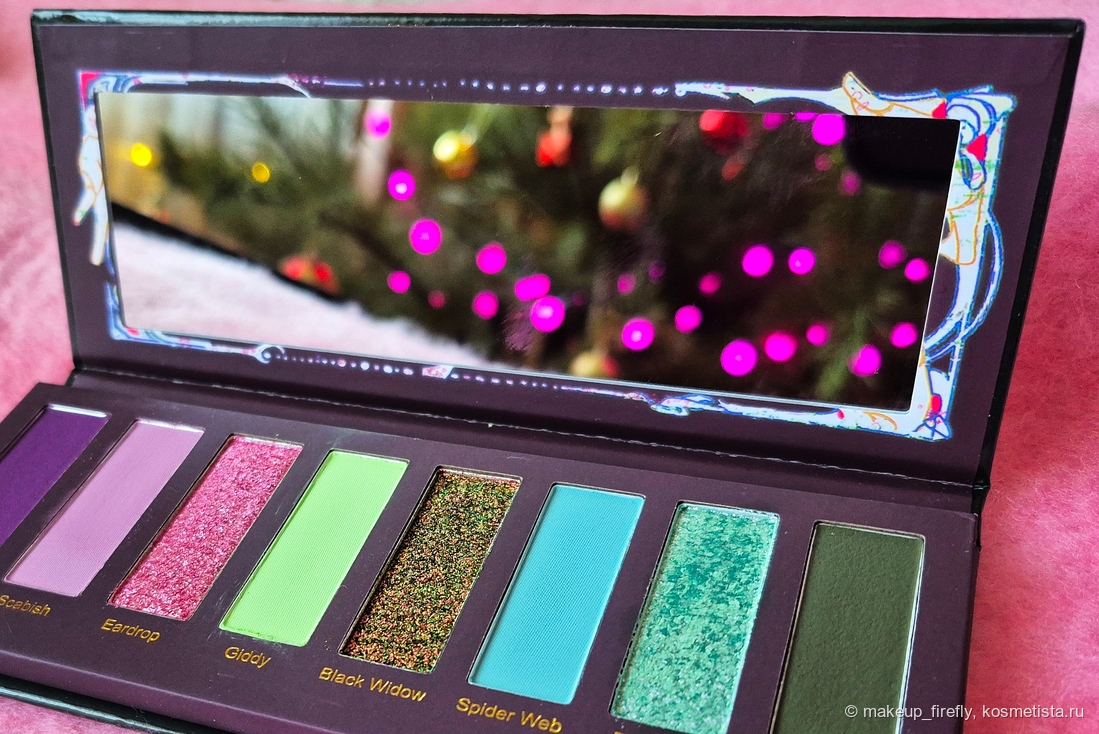 Первое, что я увидела, были свотчи палетки, и тогда она меня, конечно, зацепила своими сияшками, но когда я увидела упаковку, поняла, что хочу её в коллекцию.