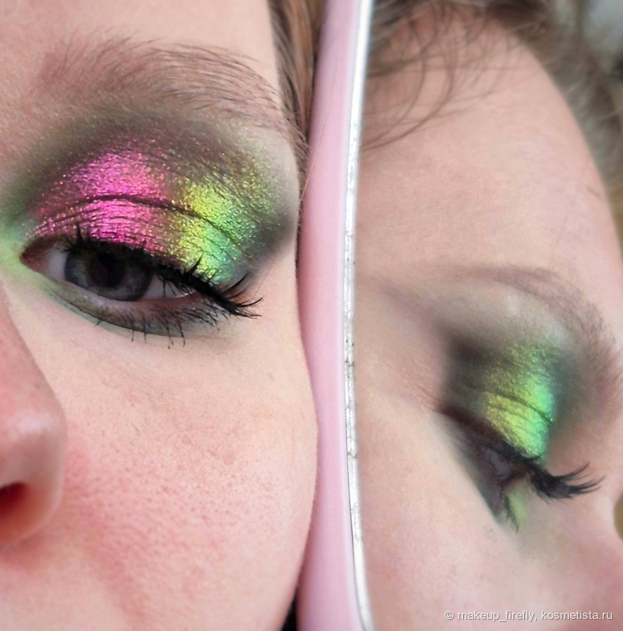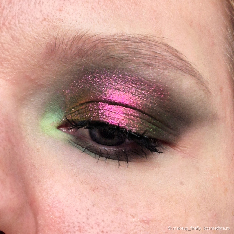 Оттенок Venom я нанесла на все веко: глубокий темно-зеленый, симпатичный и не проблемный матовый, тушевала Giddy и это ещё одно сочетание, которое мне нравится. Он отлично ложится поверх тёмного цвета и красиво подсвечивает уголок глаза. Black Widow имеет невероятно красивый «бензиновый» перелив, очень ярко выглядит на тёмной базе, но не менее яркий и без базы совсем, что видно на свотче.