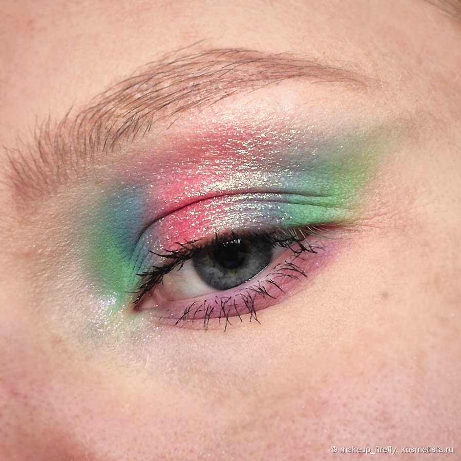 Оттенков для втушевки цветов в кожу в палетке нет, я сбивала пигмент с кисточки и проходилась ей там, где мне нужно вытянуть оттенок. Зелёный (Giddy) в работе мне понравился, не вызвал никаких вопросов, красивый чистый оттенок, хорошо наслаивается. Tuberose напоминает мне по текстуре Art Visage Illusion, не самая стойкая, под конец дня немного скатывается, но за счёт светлого оттенка это незаметно.