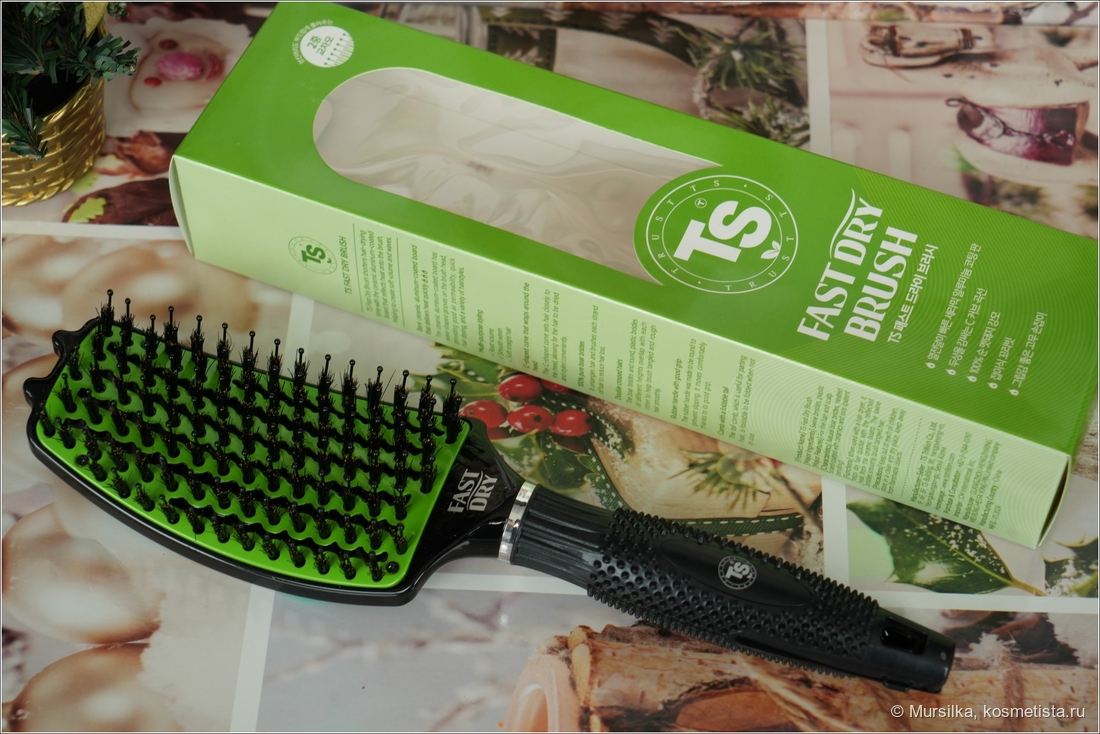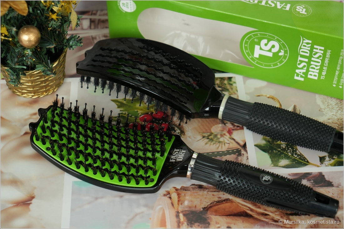 У расчёски TS есть большое преимущество перед Wet Brush — она одна сочетает щётку для расчёсывания и щётку для укладки феном (у Wet Brush я использовала две отдельные для этих целей). У неё есть продуваемое керамическое основание и устойчивые к высокой температуре щетинки. Если не нужно подкручивание волос, то можно обойтись ей одной, не используя круглую щётку. Эффект гладкости ей под силу.